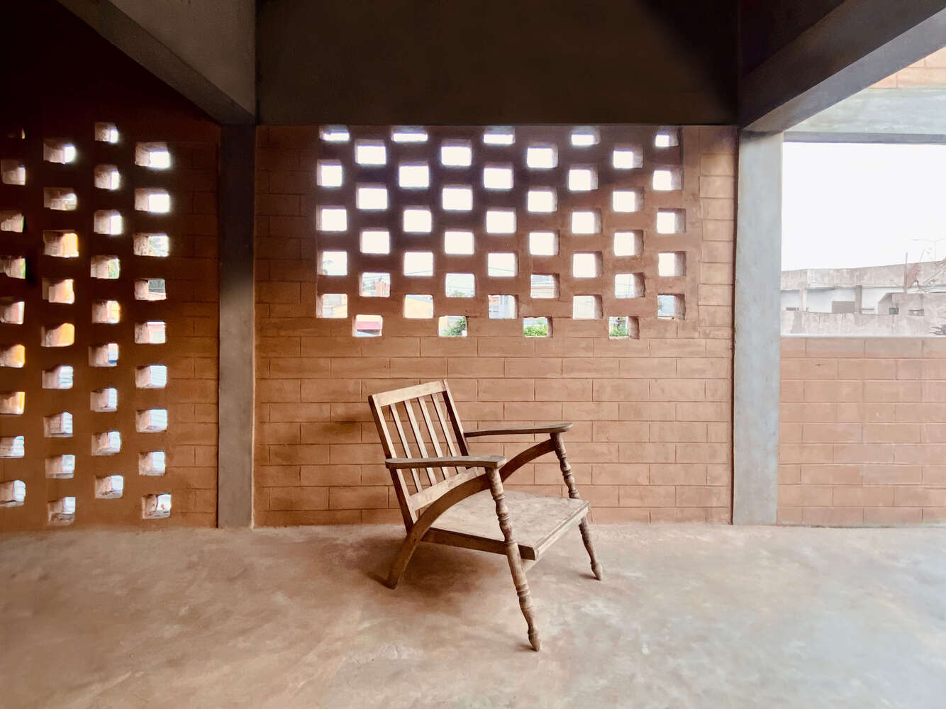The building was constructed with compressed earth blocks, building upon a simple concrete base structure cast in situ. The bricks were made with local clay and manually pressed on site, where they dried in the sun before being assembled.