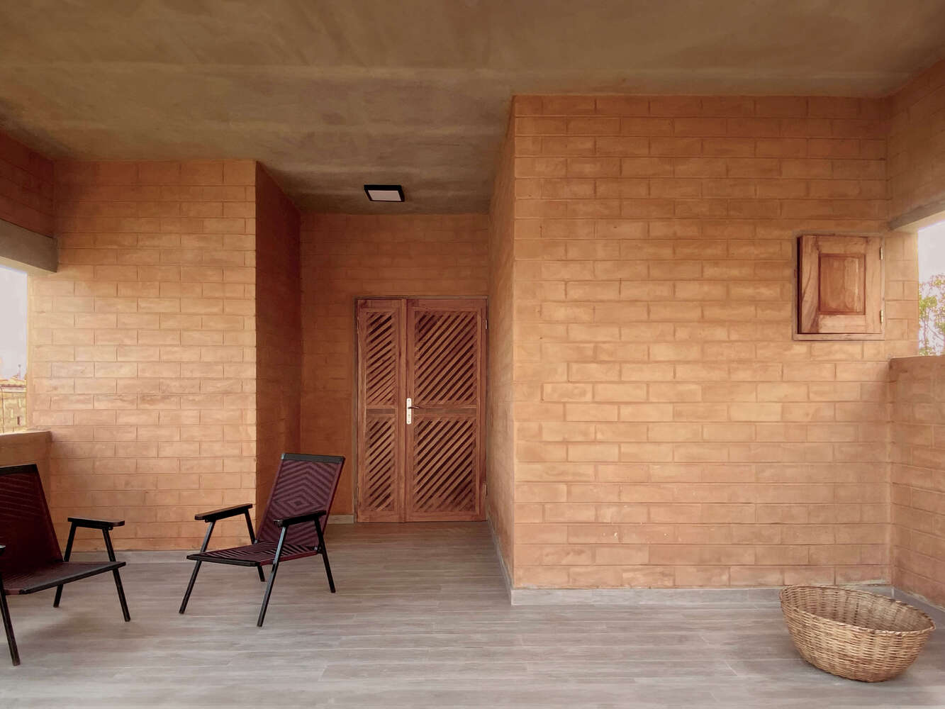A final coating of the brick walls with a mix of raw earth and lime ensures a smooth finish and better weather resistance. The project also features custom-made wooden door frames (Bè Doors).
