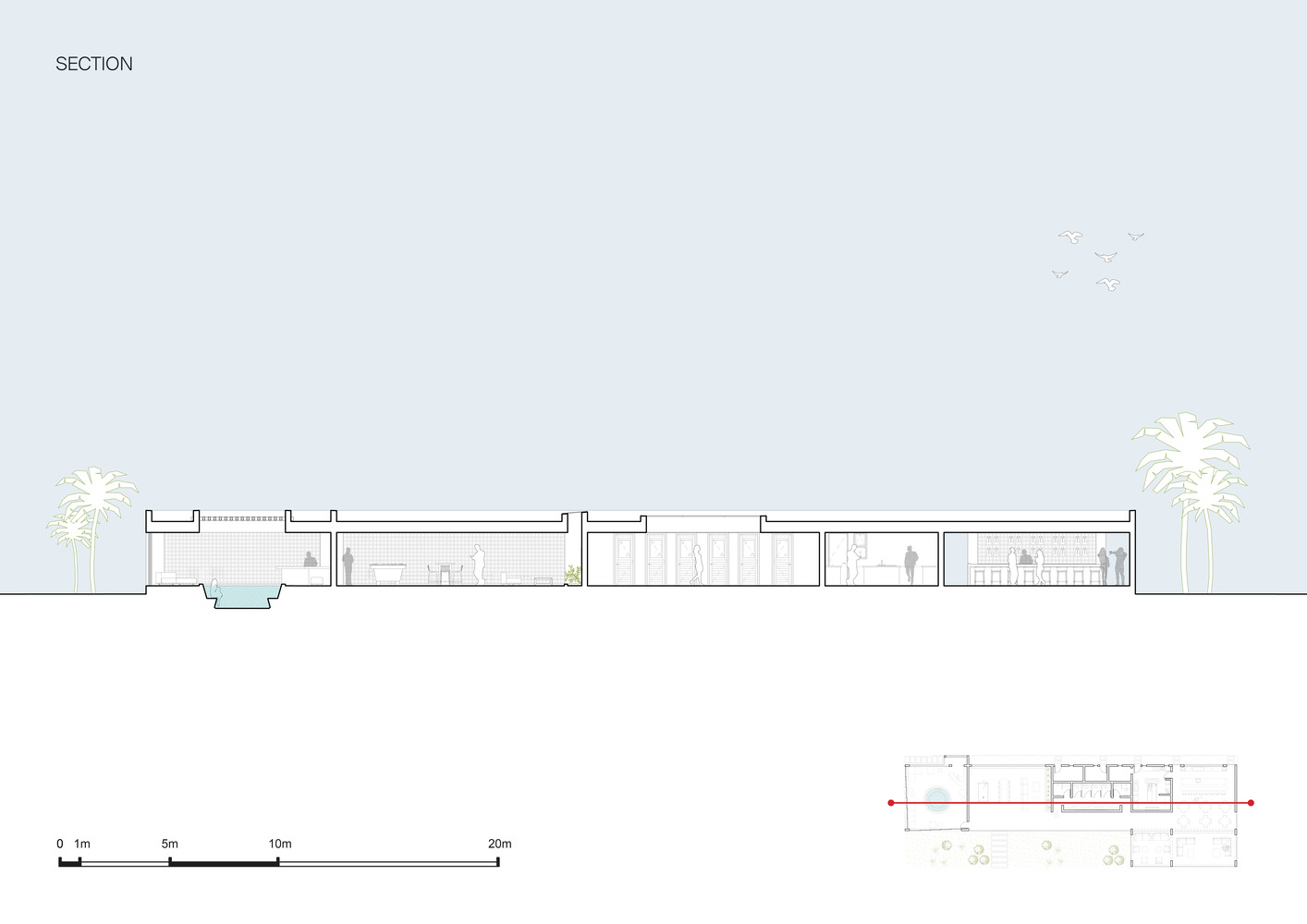 The program offers a series of interconnected spaces that encourage both leisure and interaction. A lounge opens to the sea breeze, drawing the outdoors in, while the dining area forms a vibrant hub for shared meals.