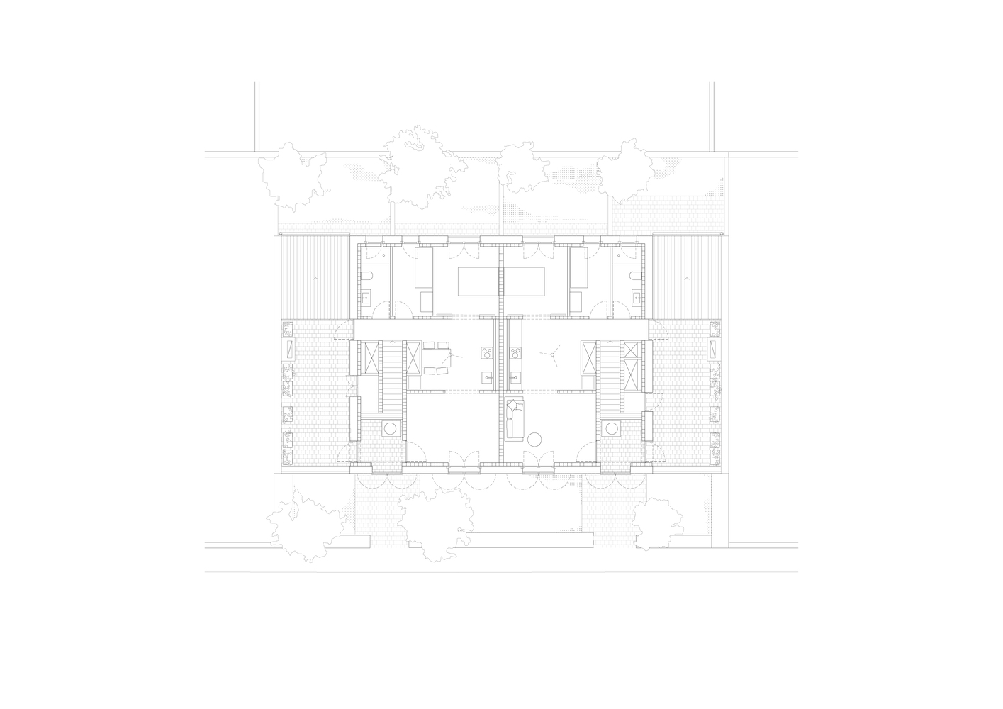 The units on the ground floor have one bedroom and access to a private outdoor space, while the apartments on the upper floor accommodate two bedrooms and open to their own exterior terrace.