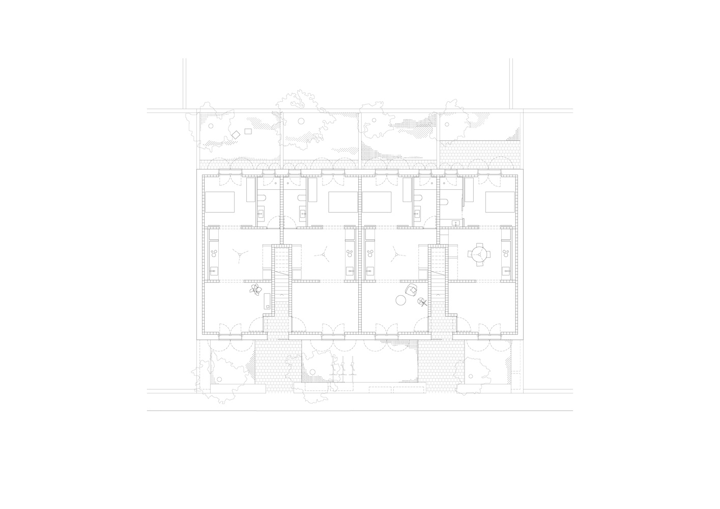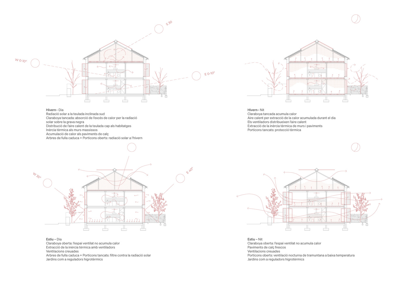 The "trombe" roof is a key element that captures heat in winter and ventilates in summer, regulating temperature and thus eliminating active systems. Finally, the private patios serve as control and filtering elements for user ventilation of the homes.