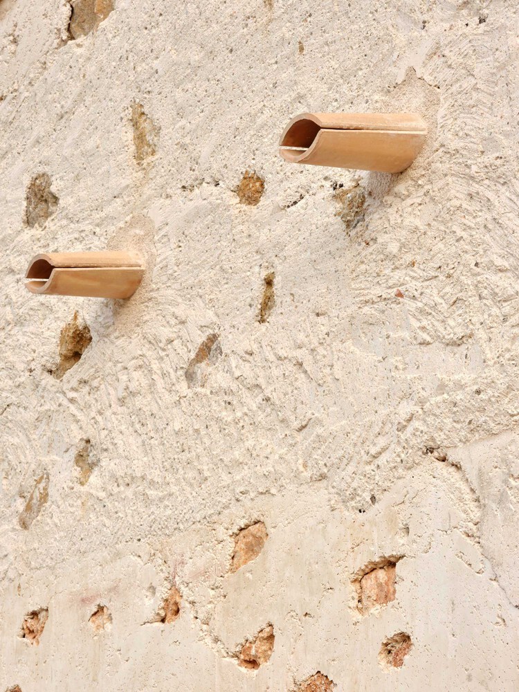 The materiality of the building responds to its surroundings, using local materials and strategies. The cyclopean lime facades incorporate stones and earth from the excavation itself.