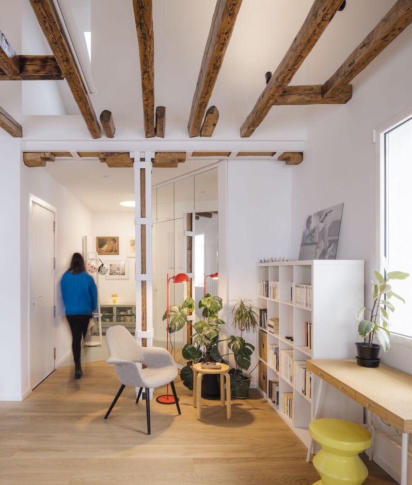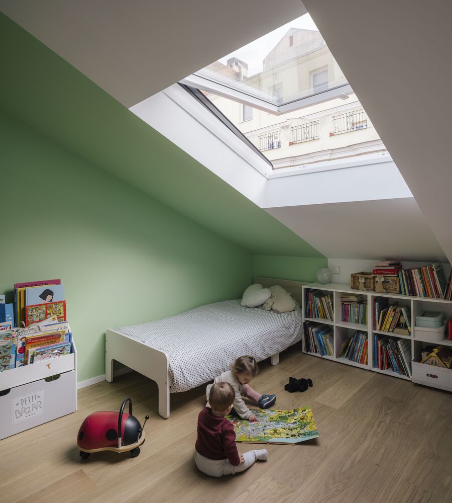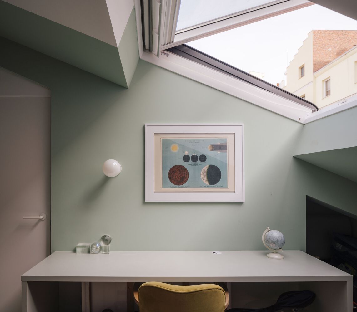 The restructuring undertaken under the roof replaces a dark space compartmentalized in small rooms and corridors with a more luminous and fluid one; an exterior that defines an interior; a new landscape and domestic volume that is revealed through variable heights and changing light, and that overturns and relates each and every one of the rooms with the unique Velázquez sky of Madrid.