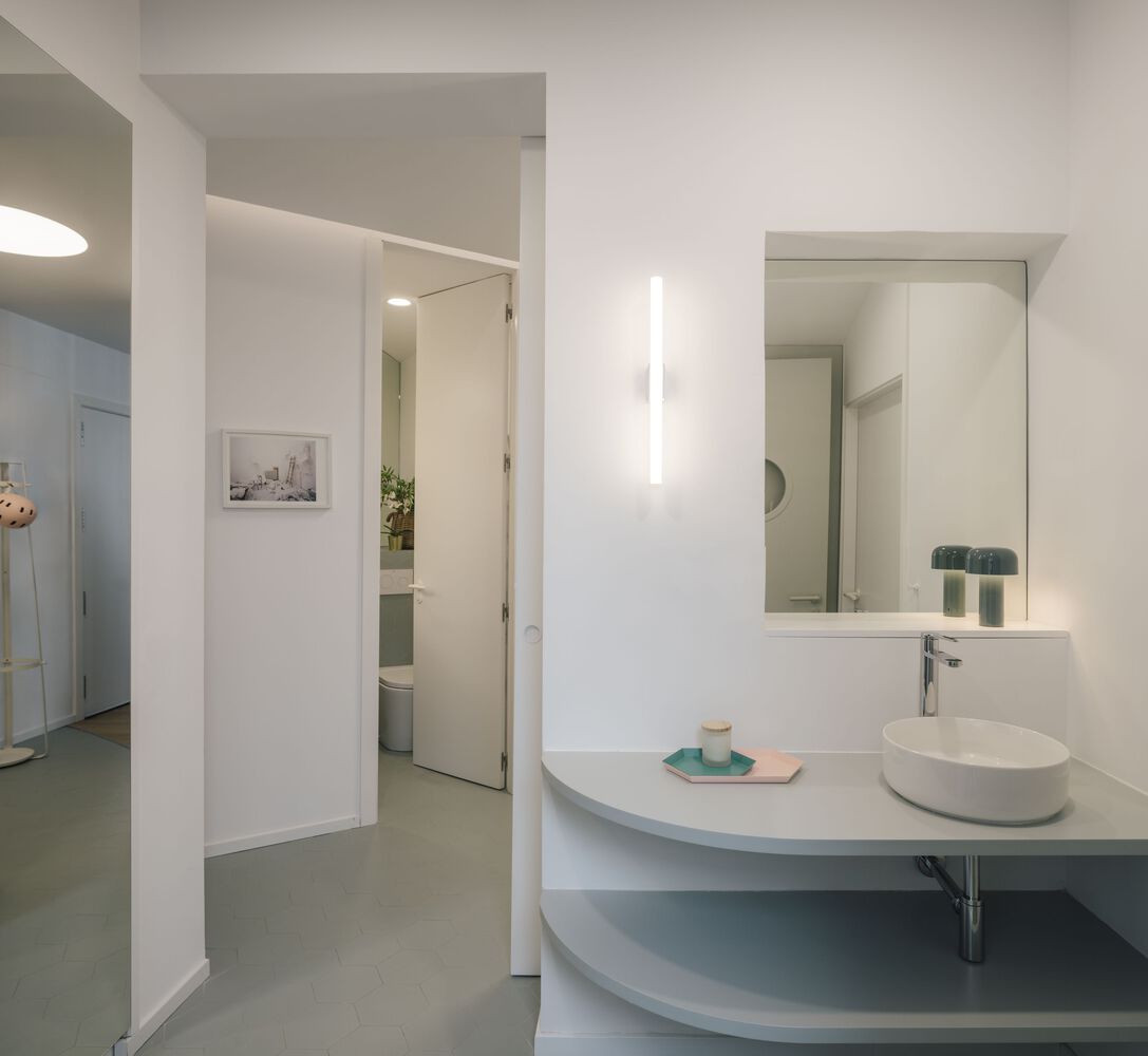 With a marked longitudinal character and a floor plan organized around three courtyards, paradoxically, despite being a penthouse, the dwelling does not establish notable links with the surrounding urban profile. Rather, as if it were the shell of an armadillo, it is closed and protected from the outside.