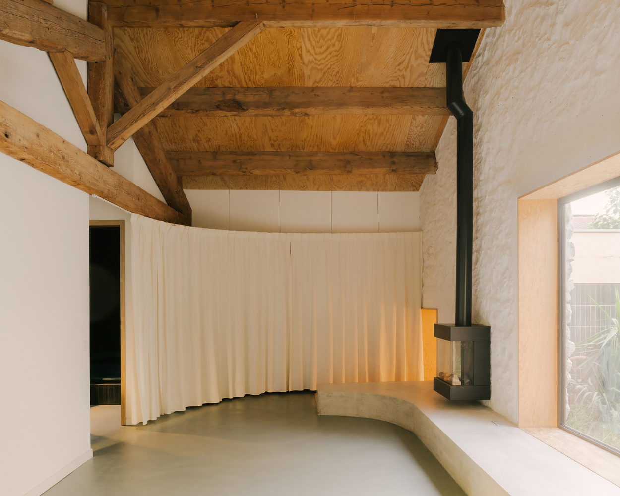 Two seven-meter-long exposed concrete lintels span over the space in order to structure it;