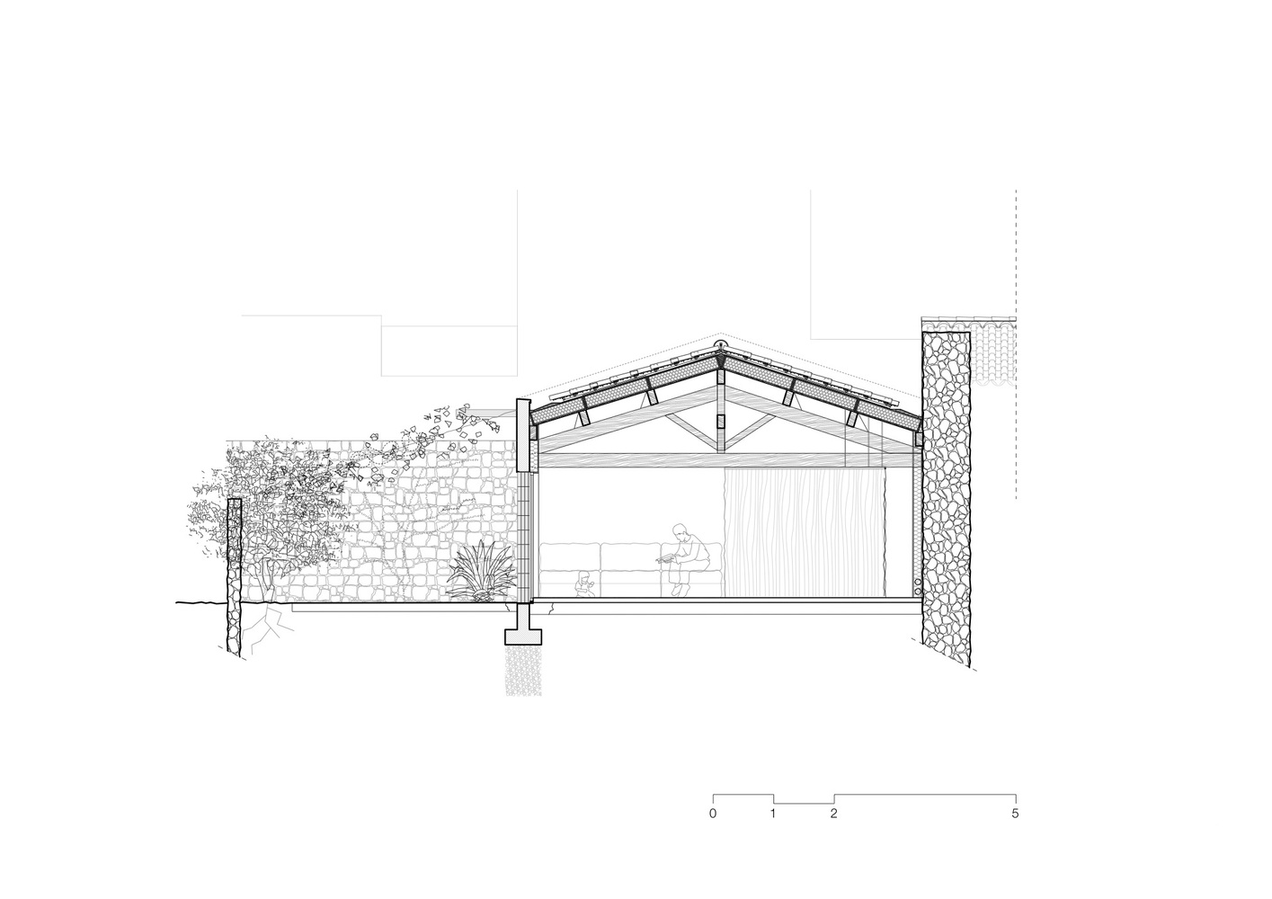 In counterpoint, a concrete stage conceals the rough lower part of the existing stone wall.