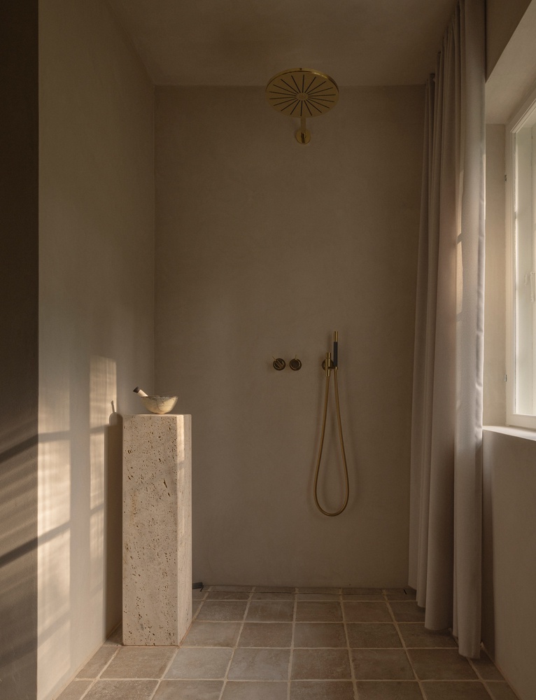 "Grounded in raw stone and solid oak, the bathroom carries a quiet strength that anchors its serenity – an atmosphere where natural materials shape both beauty and calm". - norm architects