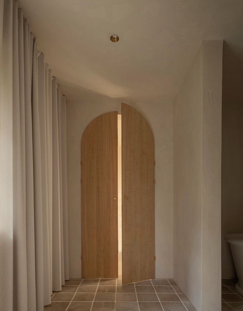 Slender, minimalist wooden doors mimic the same curved form, reinforcing the dialogue between structure and detail.