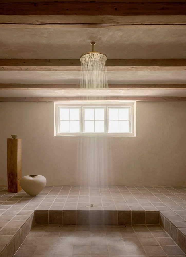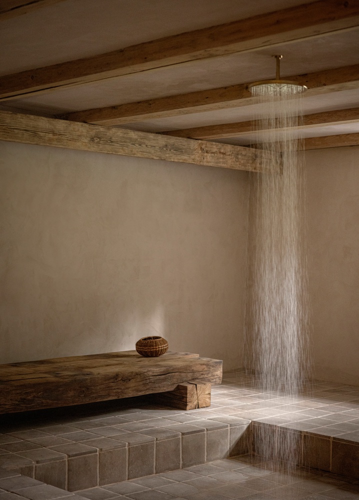 The basement has been transformed into a spa-like retreat, defined by a rustic minimalism that embraces imperfection and time.