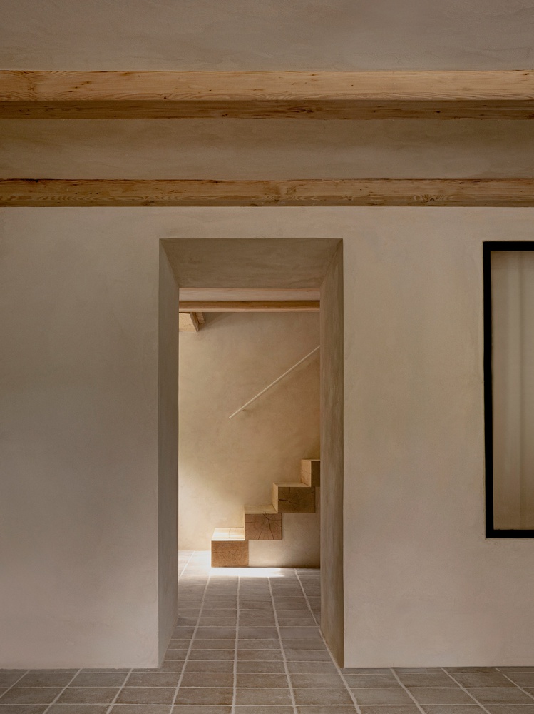 Inside, the walls and ceilings are finished with a breathable Jurassic lime glue, a material typically used only as a base layer but here left exposed for its raw, tactile beauty.