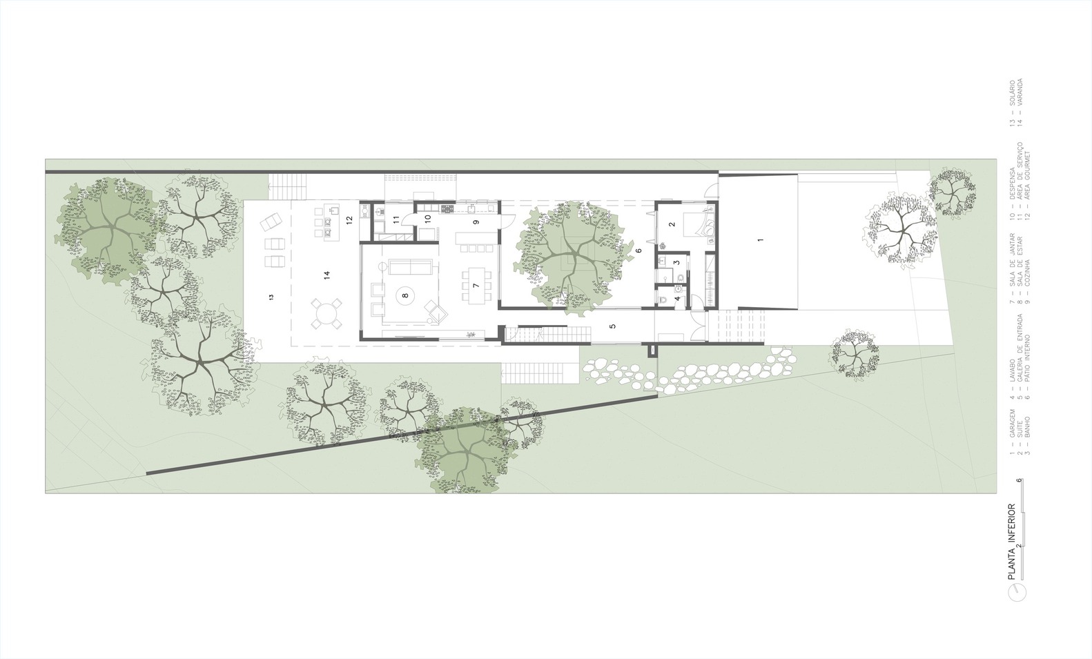 A bench and a beam molded on-site delineate the outline of the tree. The large openings and double-height spaces allow light to enter and let the exterior invade the interior, a characteristic trait of São Paulo architecture.