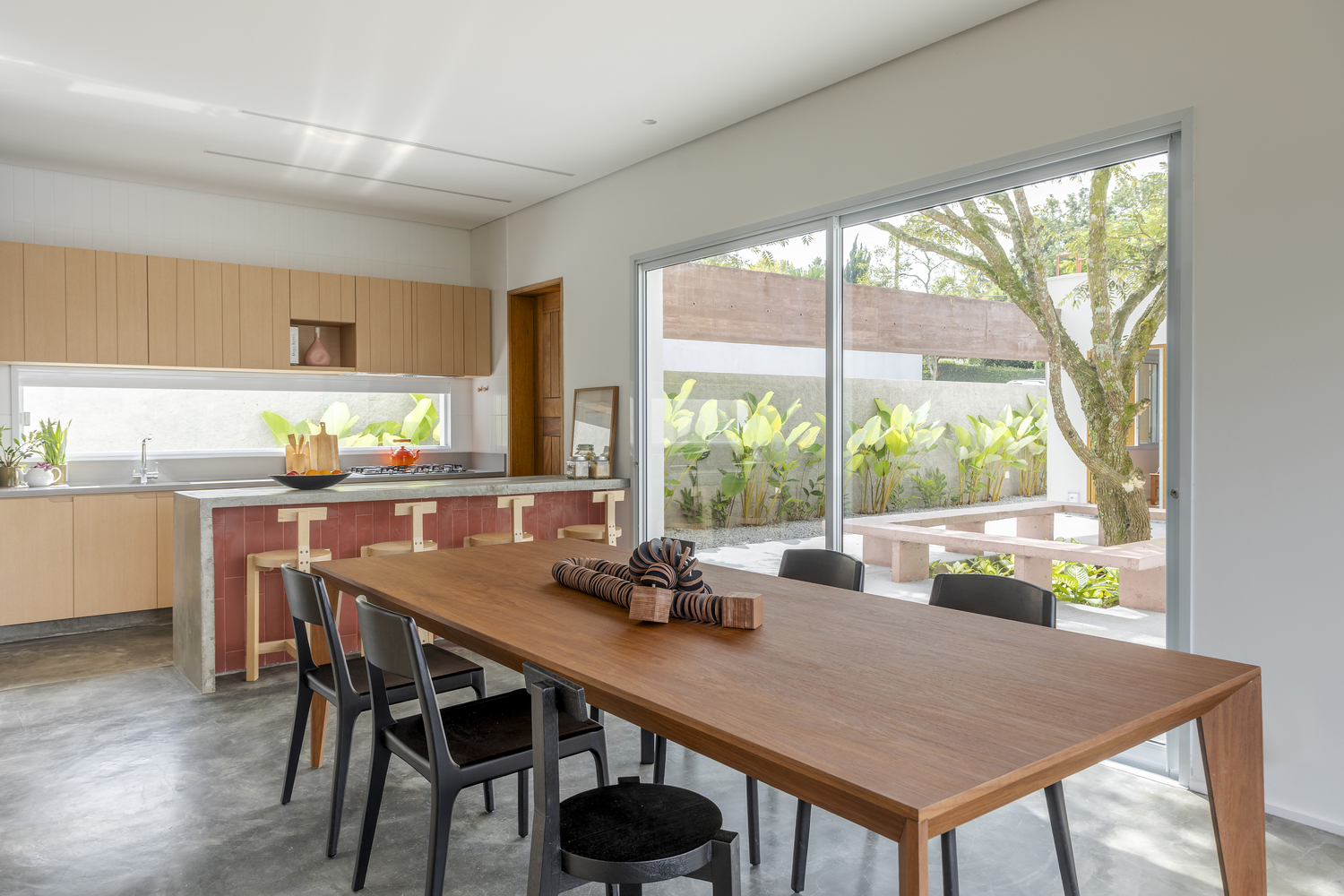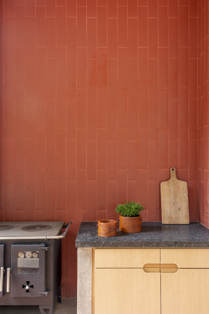 Designed to be vibrant, the kitchen features a robust concrete island accompanied by Girafa stools, designed by Lina Bo Bardi, made of solid tauari wood and chosen as a symbol of modernist philosophy.