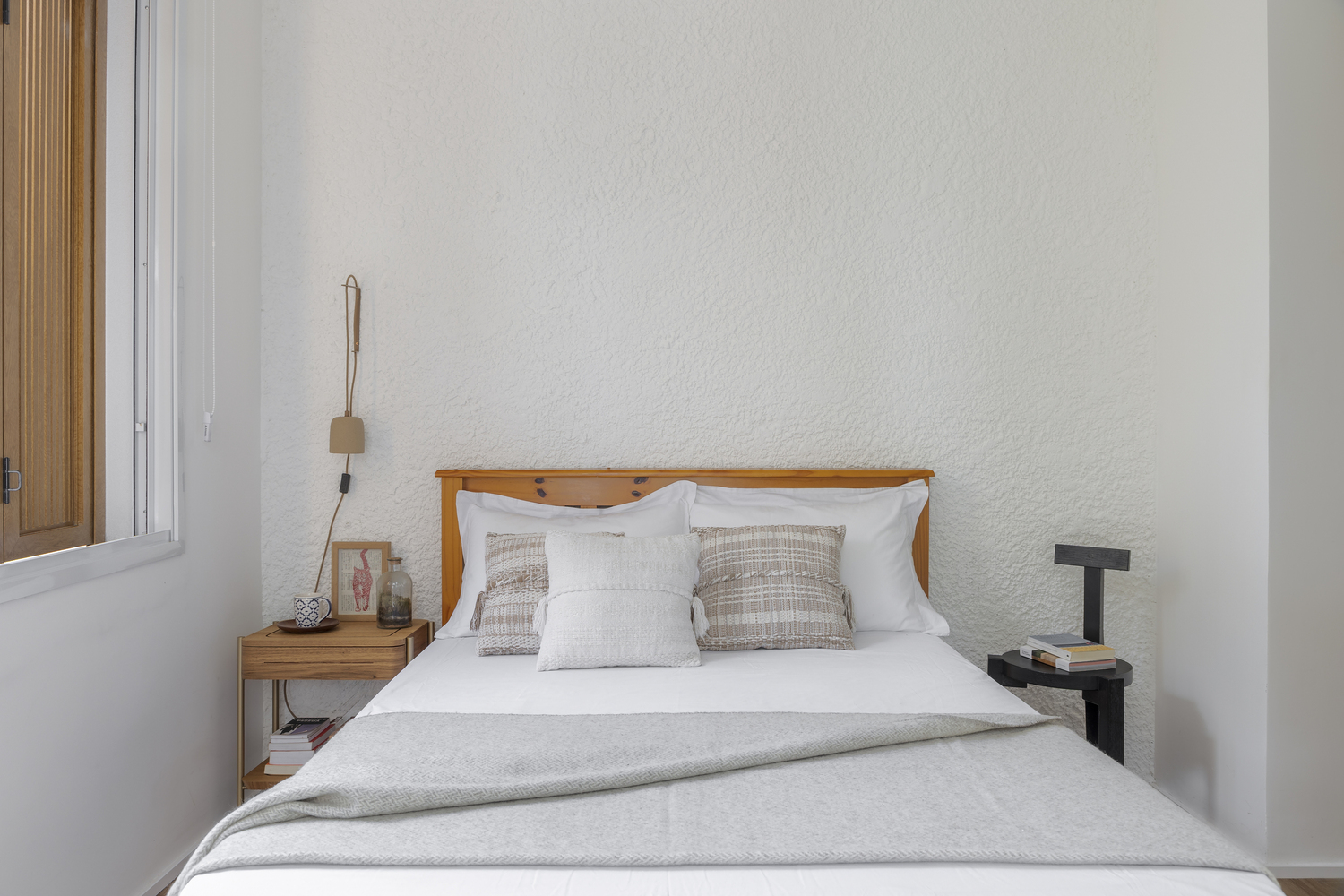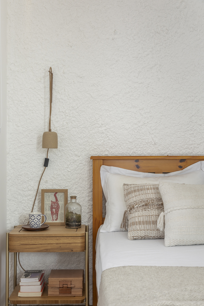 In the other suite, the wall resembles a rustic plaster finish but has a purposeful texture and a planned wardrobe with vertical niches.
