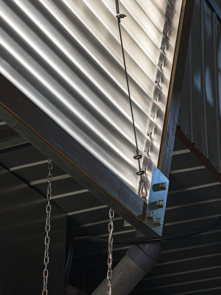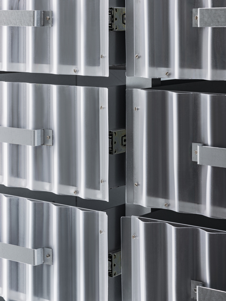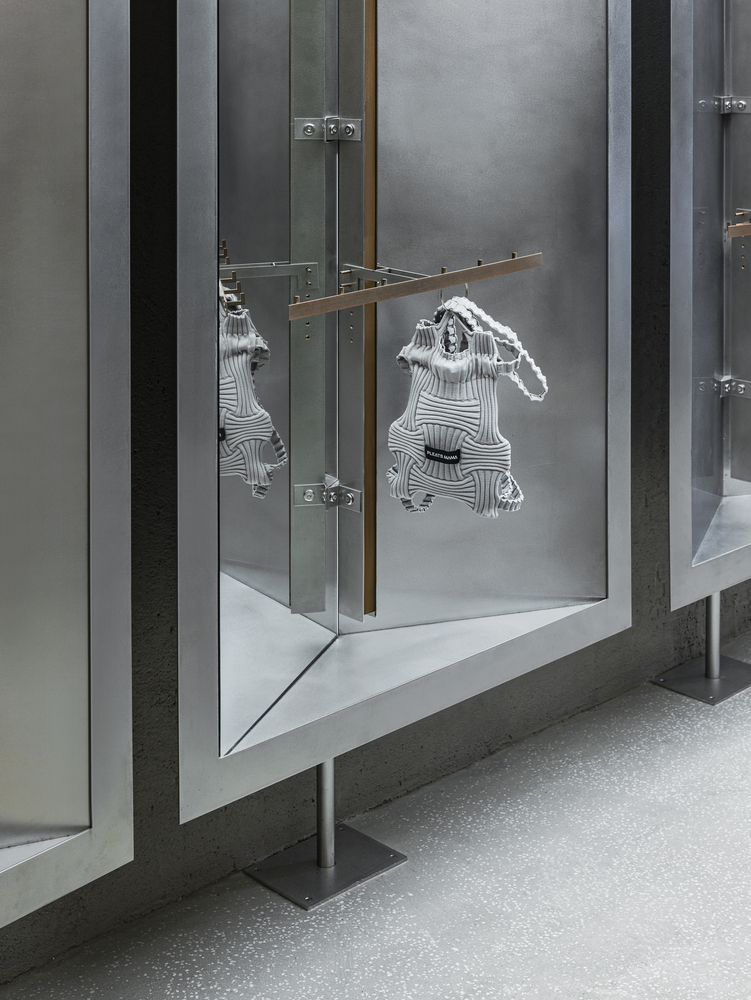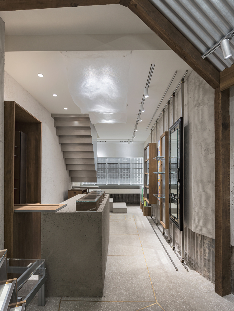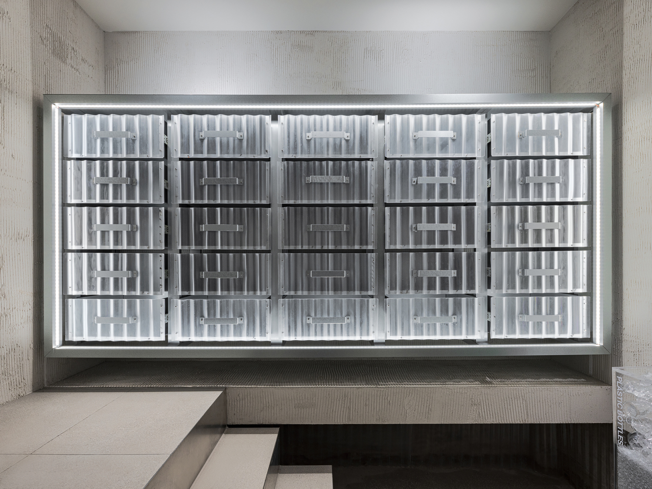 To express the brand's essence, everyday materials were reinterpreted through pleated forms—the corrugated steel roof adds rhythm, while transparent acrylic drawers enhance pleat patterns with light and reflection.