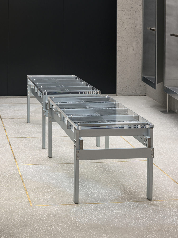 At each step, visitors encounter furniture of varying forms and materials — not merely display units, but spatial objects that reinterpret the ever-changing scenes of the marketplace.