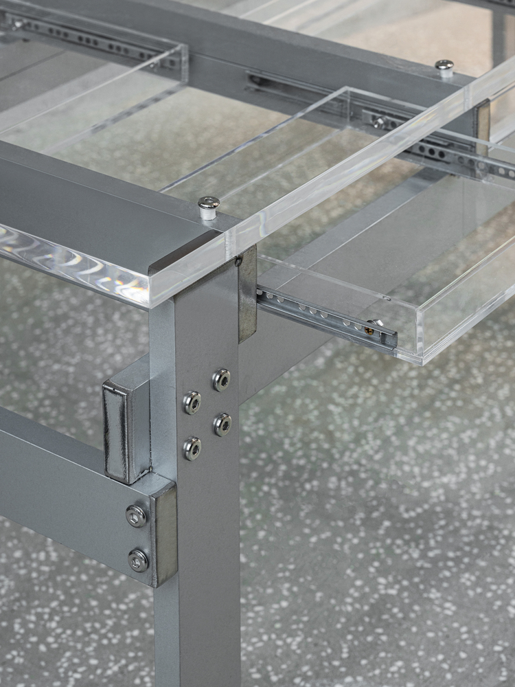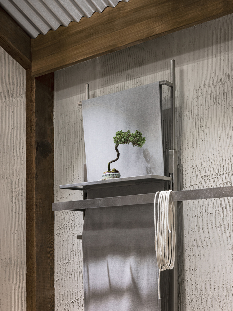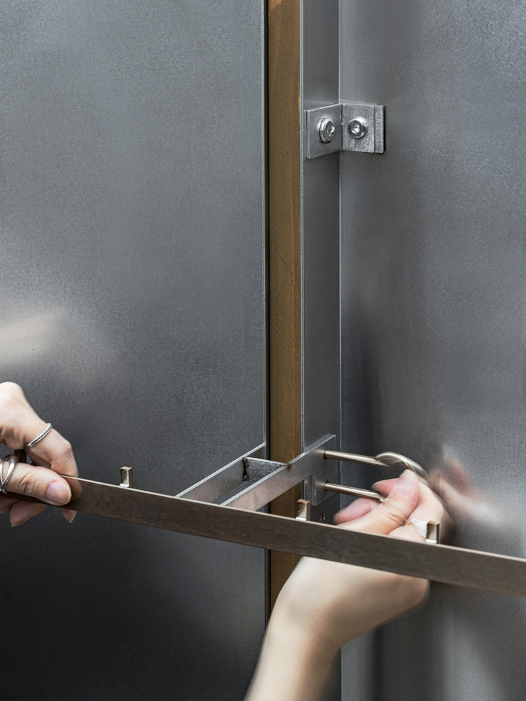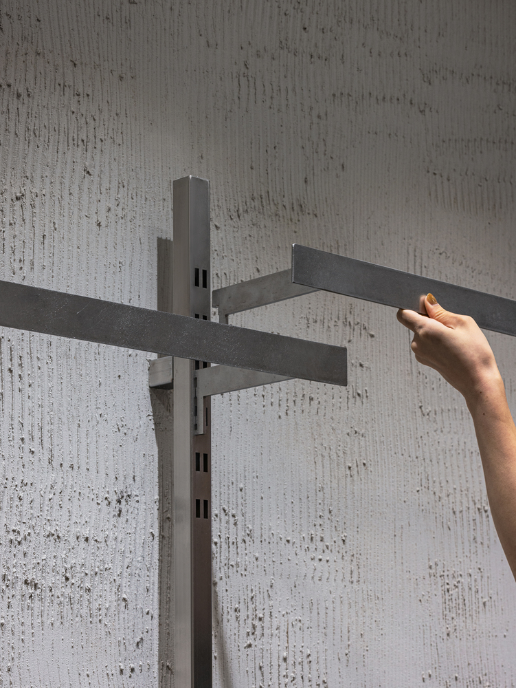 Inspired by the fastening logic of the traditional Korean binyeo hairpin, the structure uses a metal-pin connection that allows shelves and rails to be intuitively attached or rearranged.