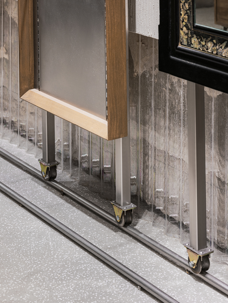 The first impression is defined by translucent corrugated Lexan panels — an everyday material often seen in Gwangjang Market — which introduce the brand through a familiar yet distinctive texture.