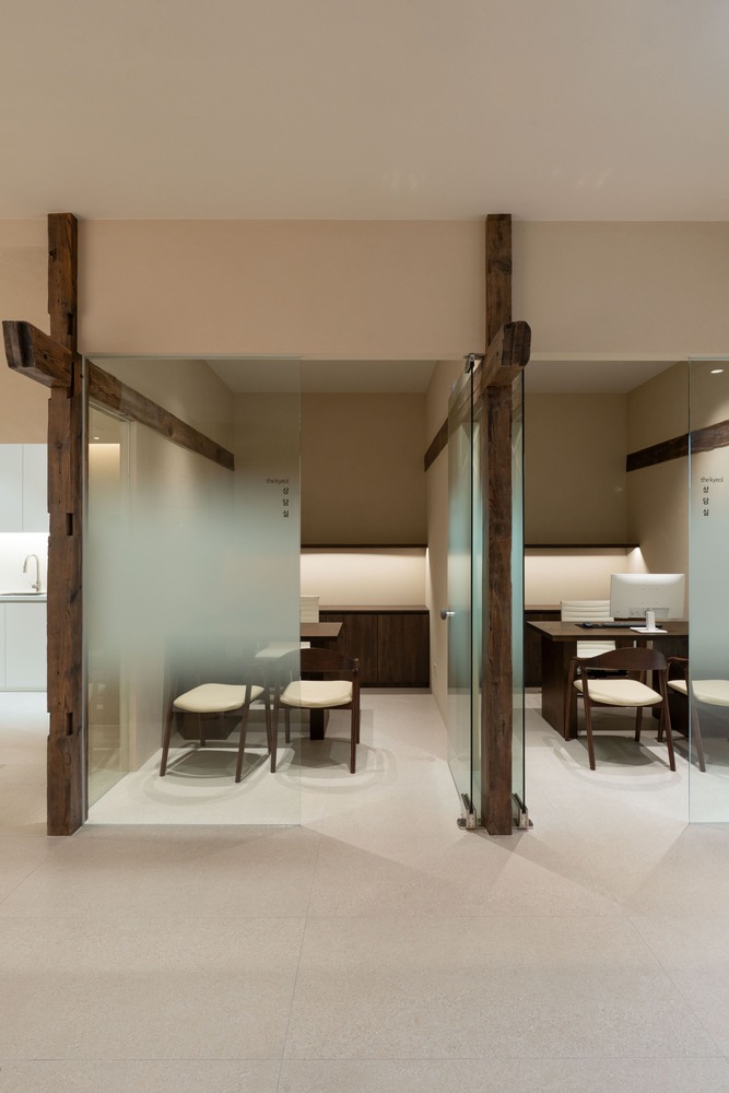 In the counseling and director's rooms, the reclaimed wood columns reinterpret the structural rhythm of traditional Korean buildings.