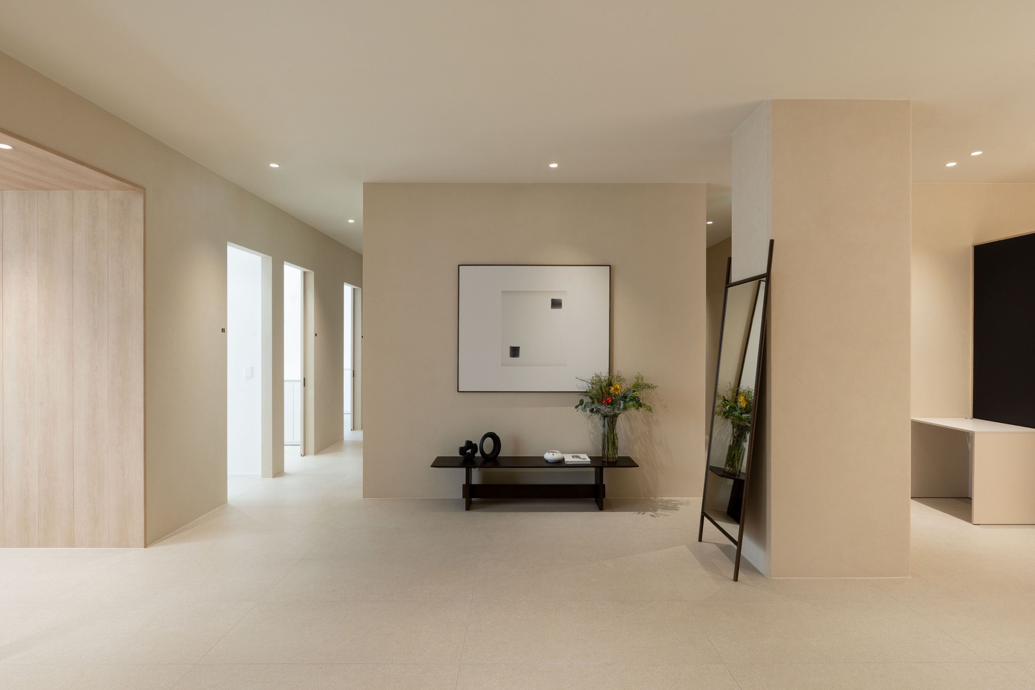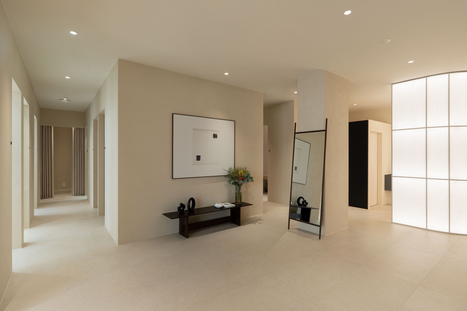 Minimal lines and soft, light-colored wall finishes highlight spatial calmness, while glass doors inspired by the soft haze found in Korean ink paintings lend an atmospheric quality.