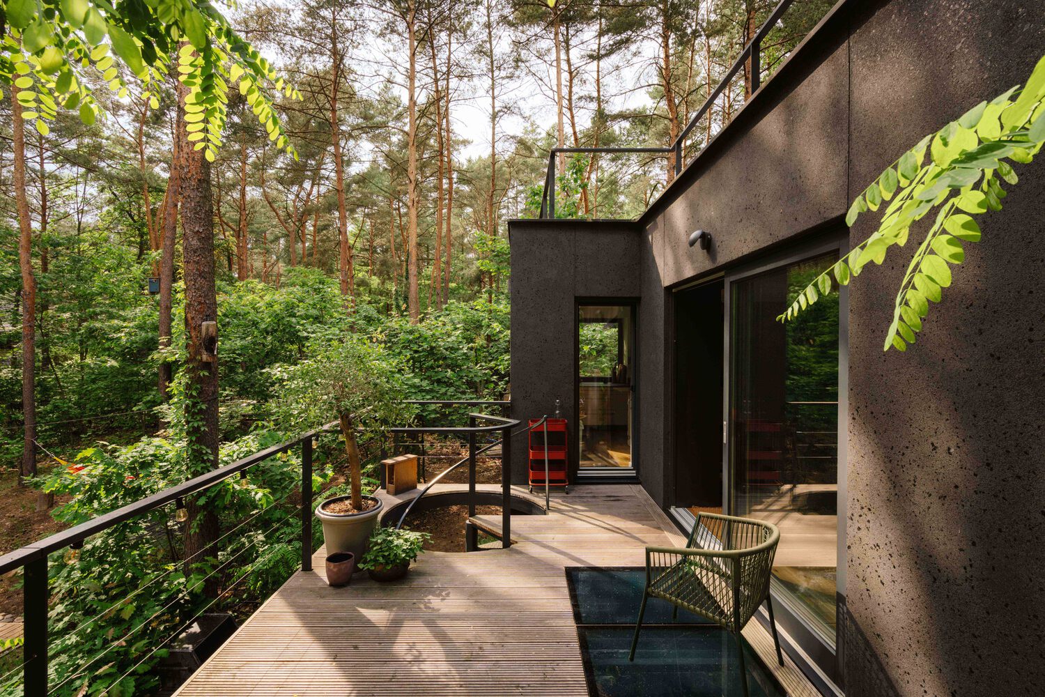 Our common goal was to discreetly hide the abode among the trees and create a contrast between the camouflaged exterior (I initially suggested literally covering the building with a military camouflage-alike mural) and the warmth of the eclectic interior.