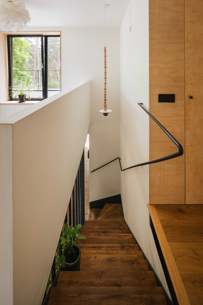 The house is located in one of the villages near Warsaw, close to a river, surrounded by a gently sloping mixed forest.