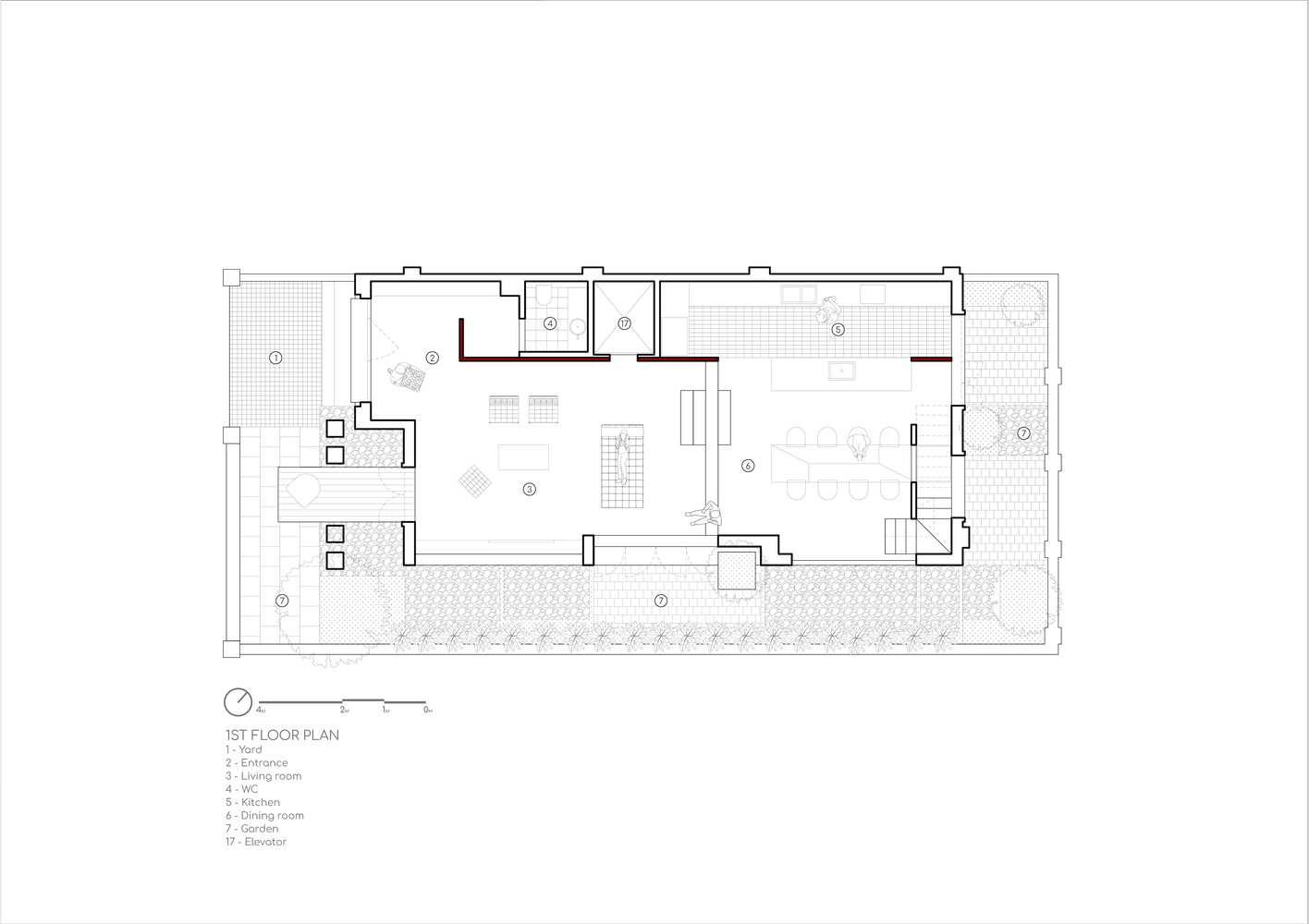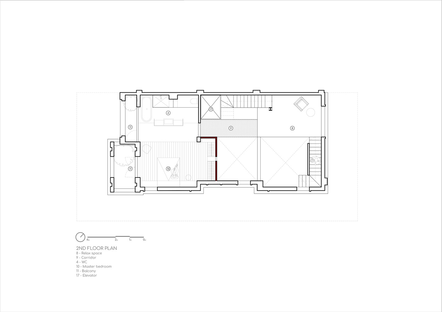 The original house model of B.Red House is a typical type within the area, organized around a central staircase that divides the plan longitudinally into two primary functional blocks.