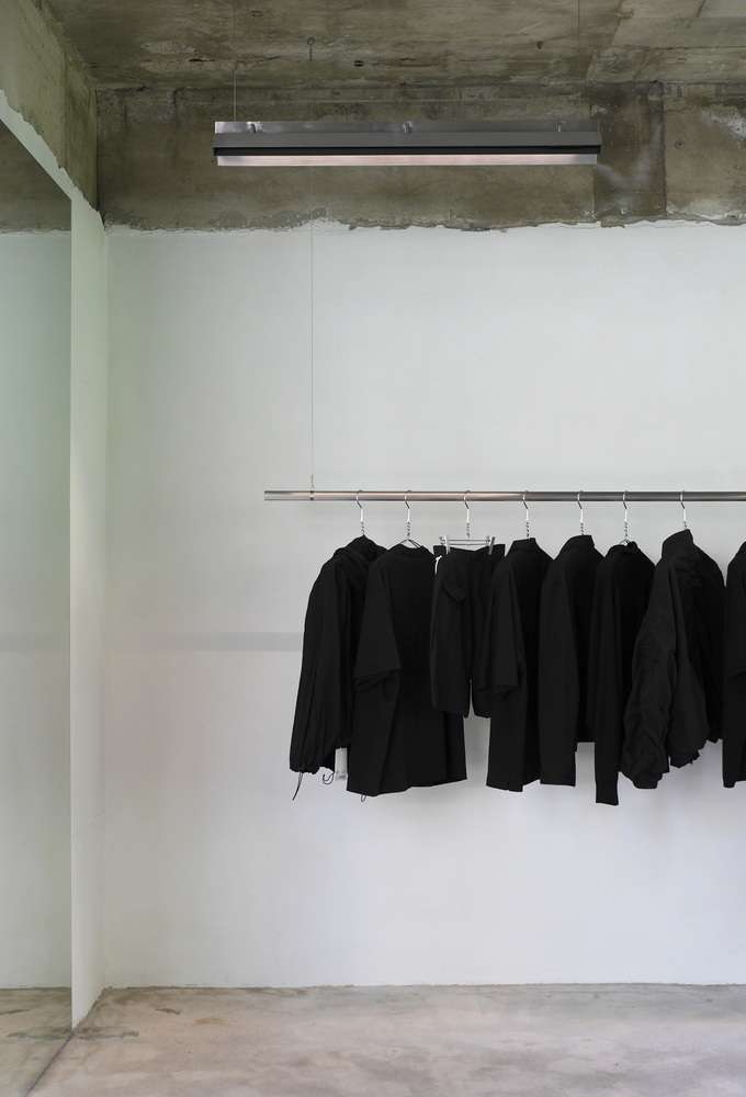 Imagining clothes hanging on racks, seemingly floating, with the ceilings of the second and third floors visible above.