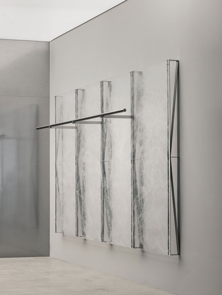 Similarly, the metal panels, large in scale near the entrance, become finer and more intricate closer to the display fixtures.