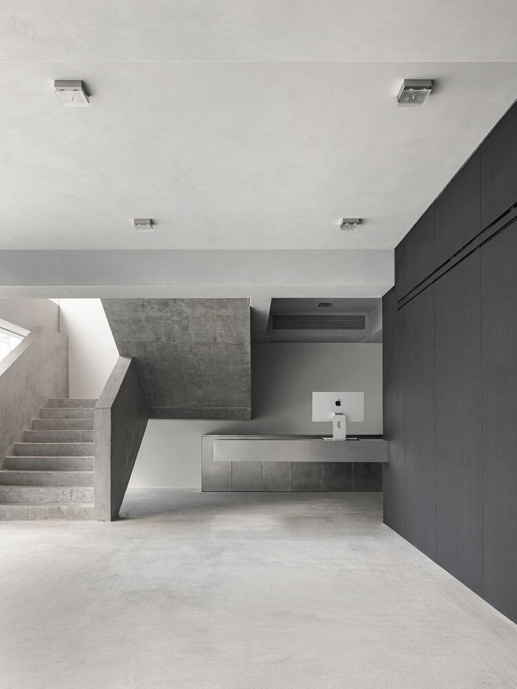 Material transitions play a significant role in shaping this experiential journey. The polished concrete flooring at the entrance gradually transforms into smaller-scale concrete tiles toward the interior, creating a tactile sense of depth.