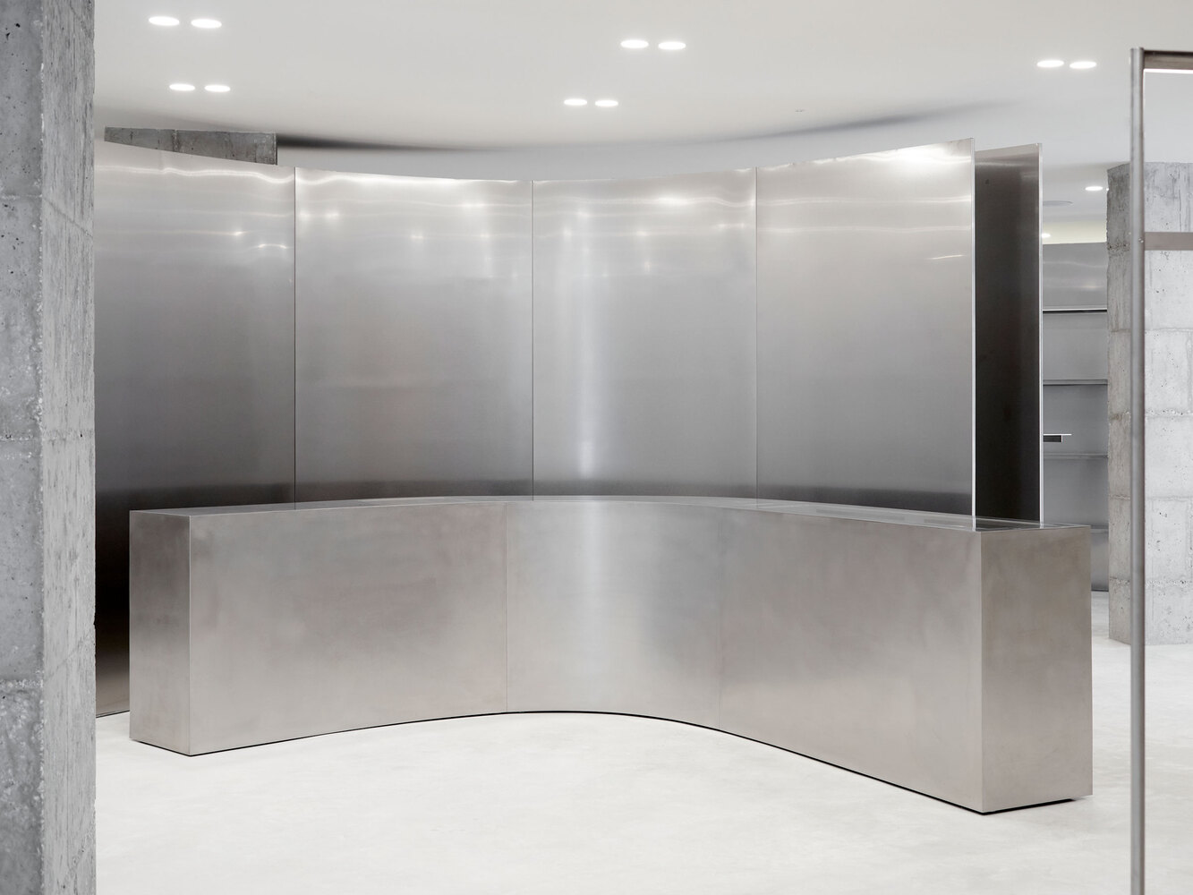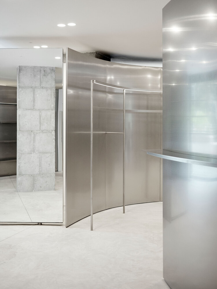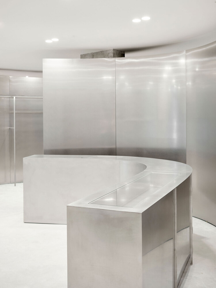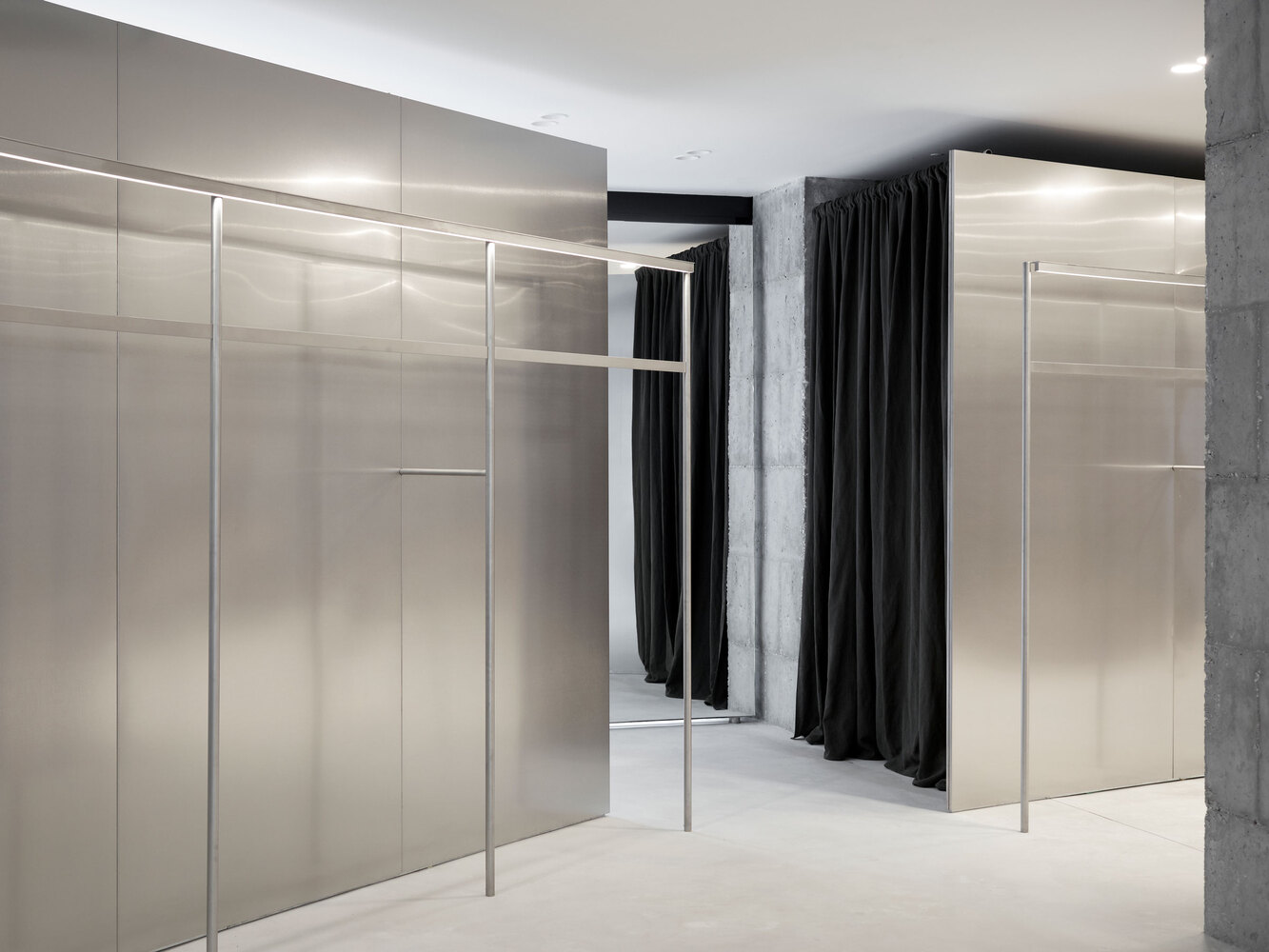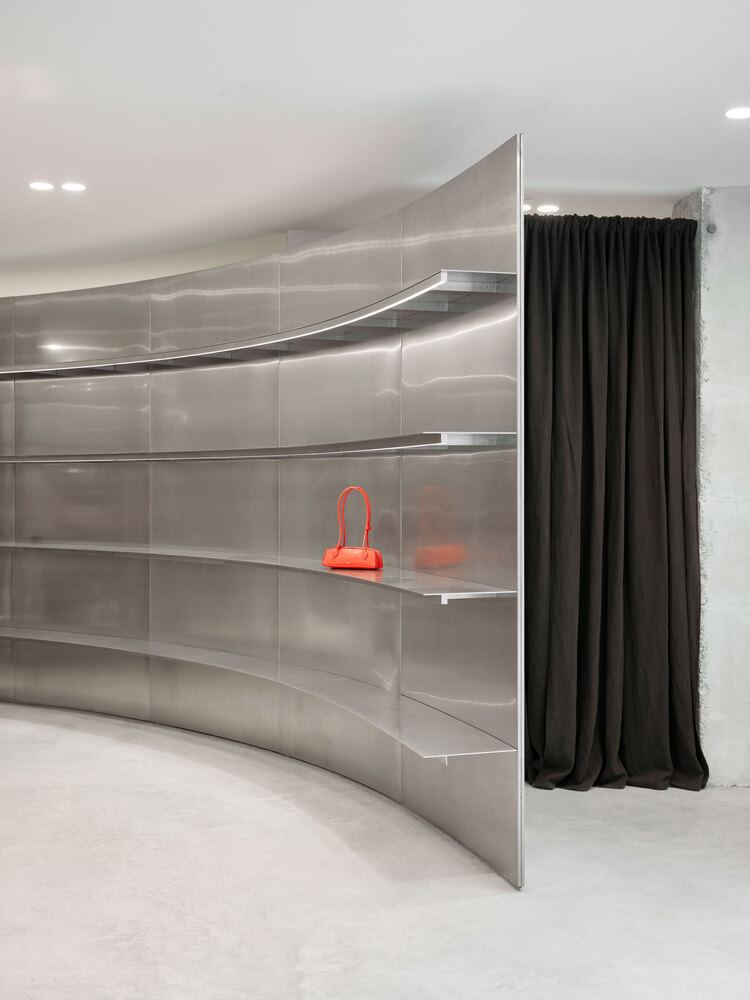 Elements: -1 2700mm high and curved walls, -2 hanging rails with integrated light track, -3 pivot doors with a mirror, -4 stainless steel counter with integrated cash desk, -5 shelves with integrated light track