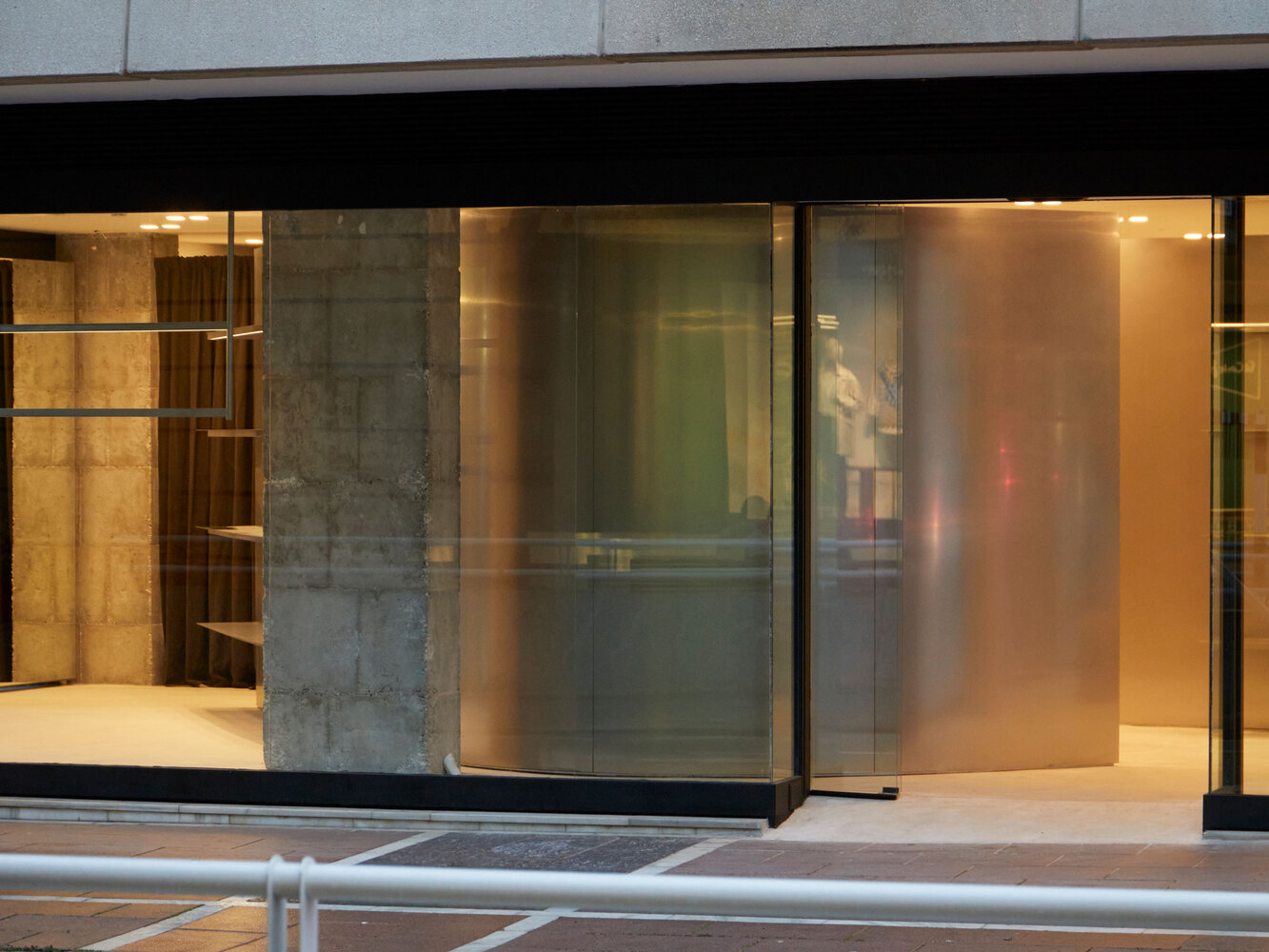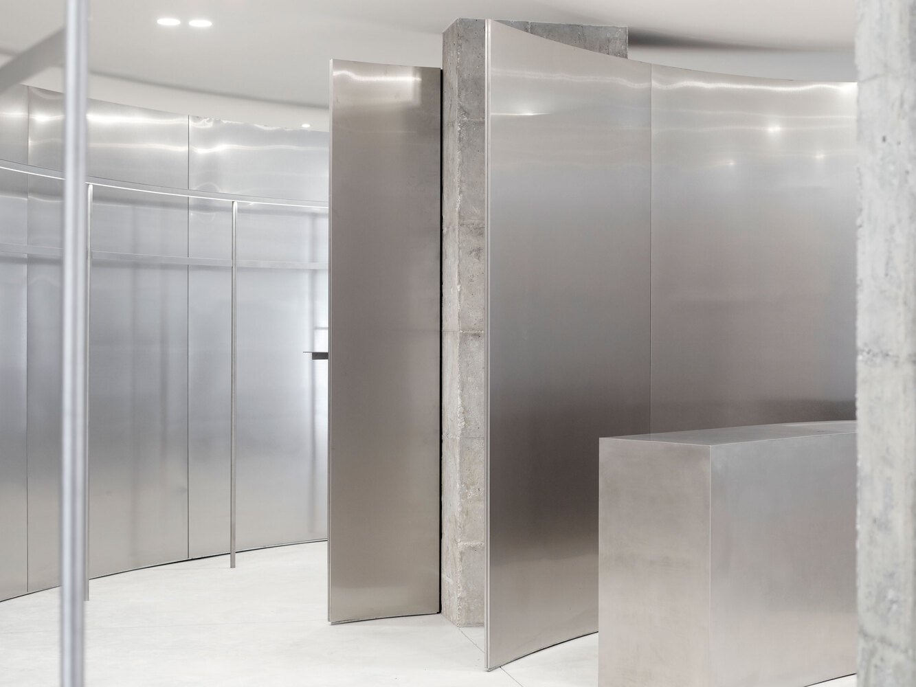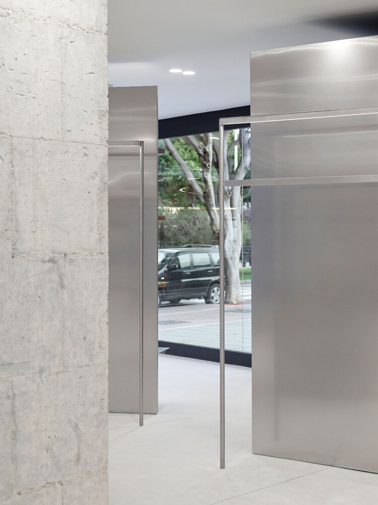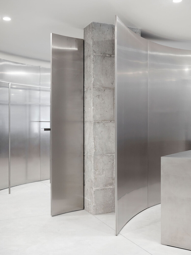 Elements: -1 2700mm high and curved walls, -2 hanging rails with integrated light track, -3 pivot doors with a mirror, -4 stainless steel counter with integrated cash desk, -5 shelves with integrated light track