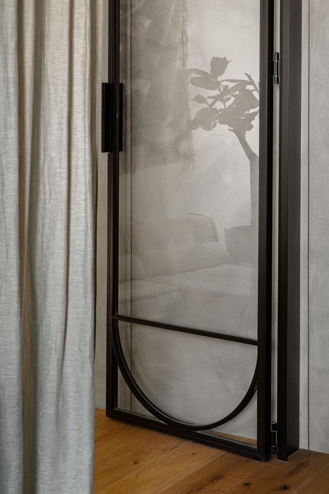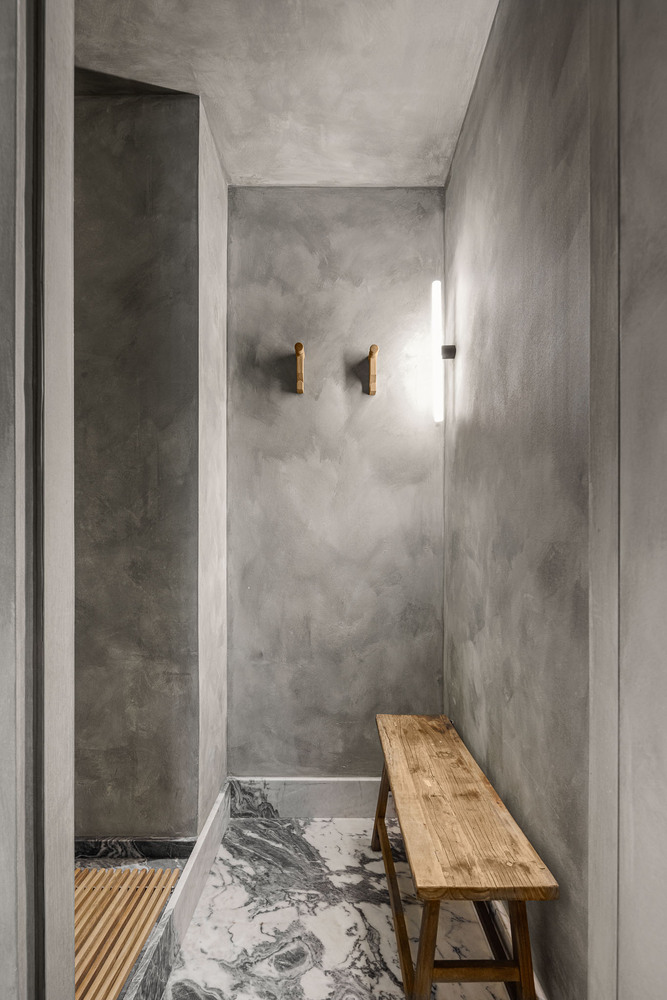 Natural materials and neutral tones define the calm atmosphere — oak wood, tiger-skin marble, linen curtains, and mineral paints in soft textures and neutral shades create a sensorial and welcoming environment.