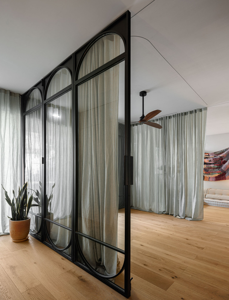 Glass partitions and curtains allow the atmosphere to be adjusted according to activities, ensuring flexibility and spatial fluidity.