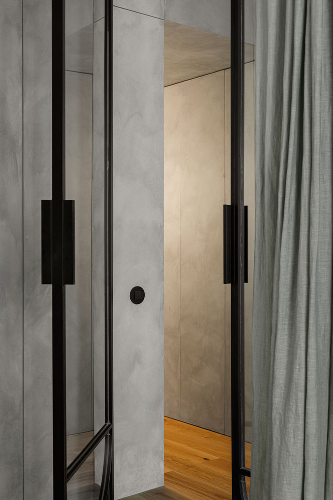 Between these two areas, a volume concentrates the service zones — storage, shower, and restroom — forming a cohesive block that structures the space, conceals existing structural elements, and frees up the remaining area.