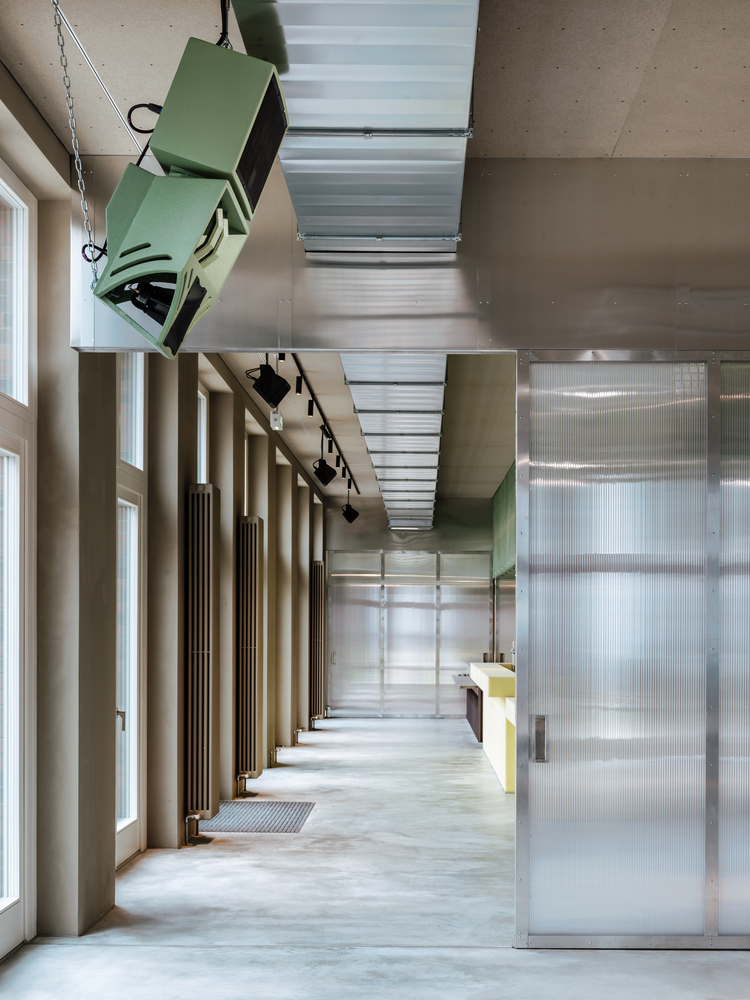 The space's flexibility is further enhanced by a custom system of movable walls. Made from aluminum profiles and filled with polycarbonate, these walls divide the space into three distinct areas: a canteen, bar, and event venue.