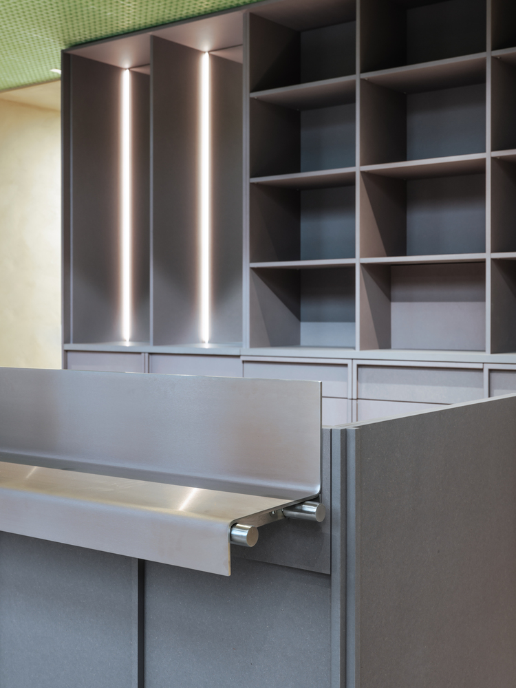 The bar counter, layered and wrapped in rubber, originated in food production and presents a solid functional object. The massive volume is divided into two levels.