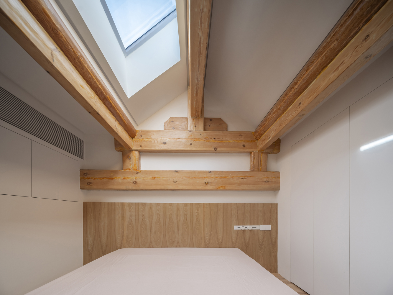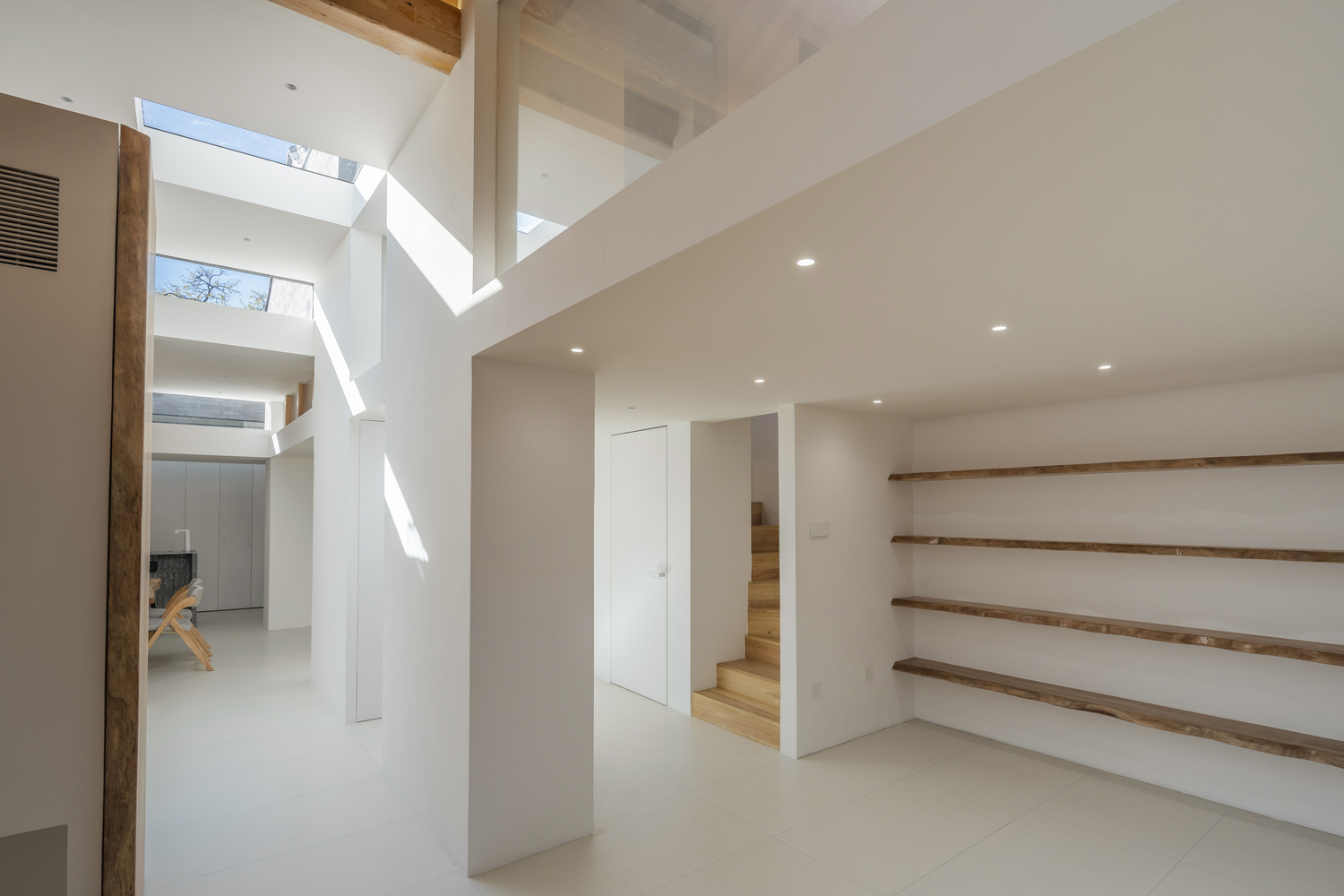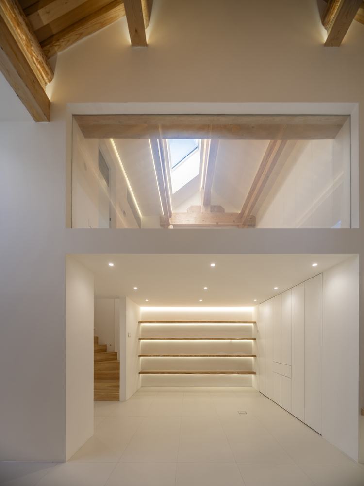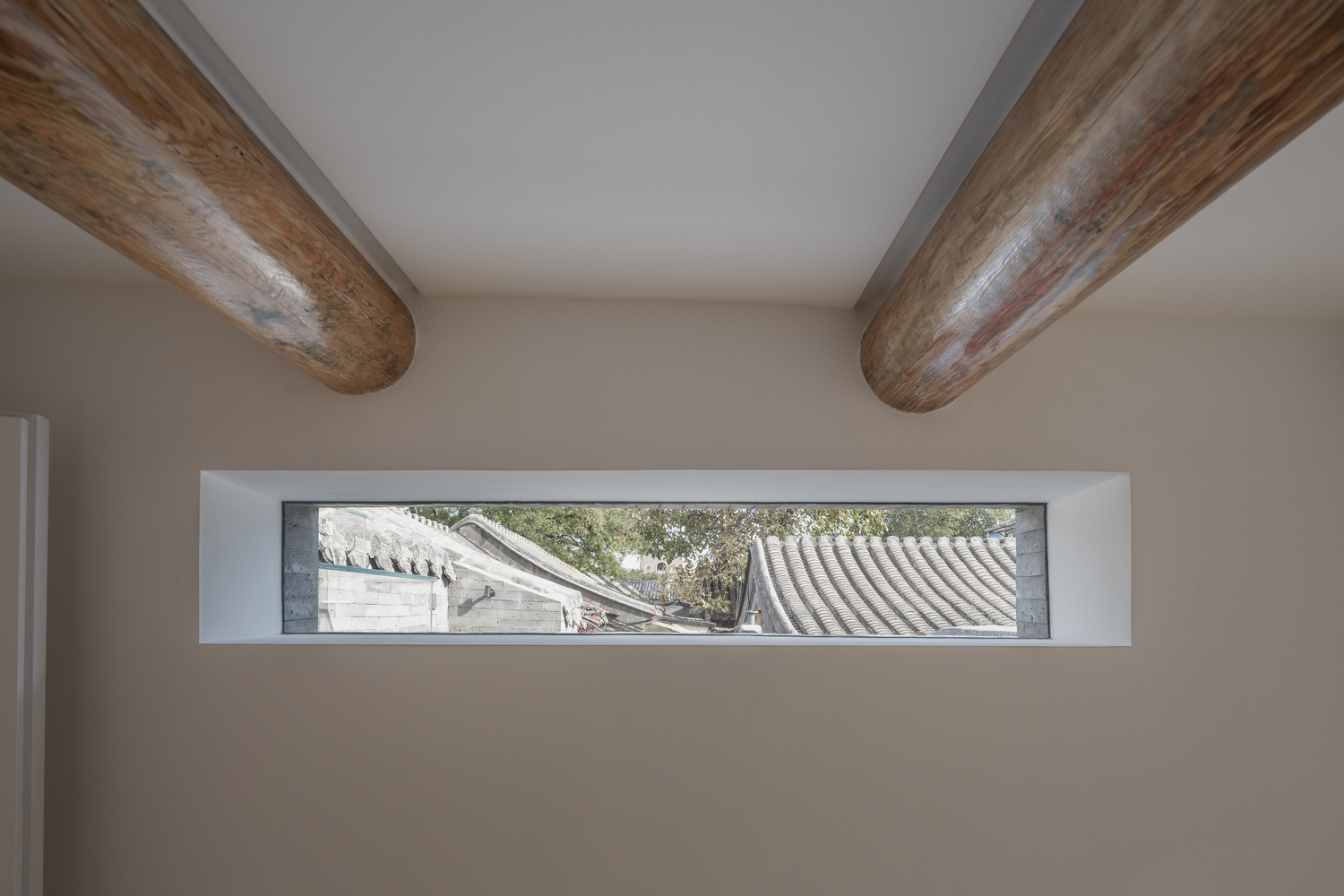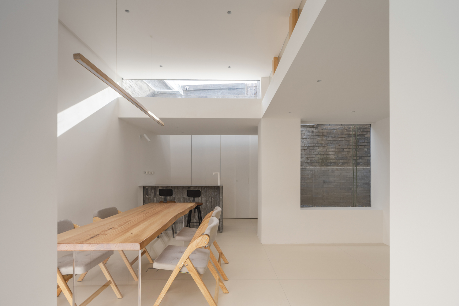 -The mezzanine level houses two bedrooms and a bathroom, with strip windows along the staircase landing, offering views of Beijing's Bell Tower and the ancient tree's interplay with light and shadow.