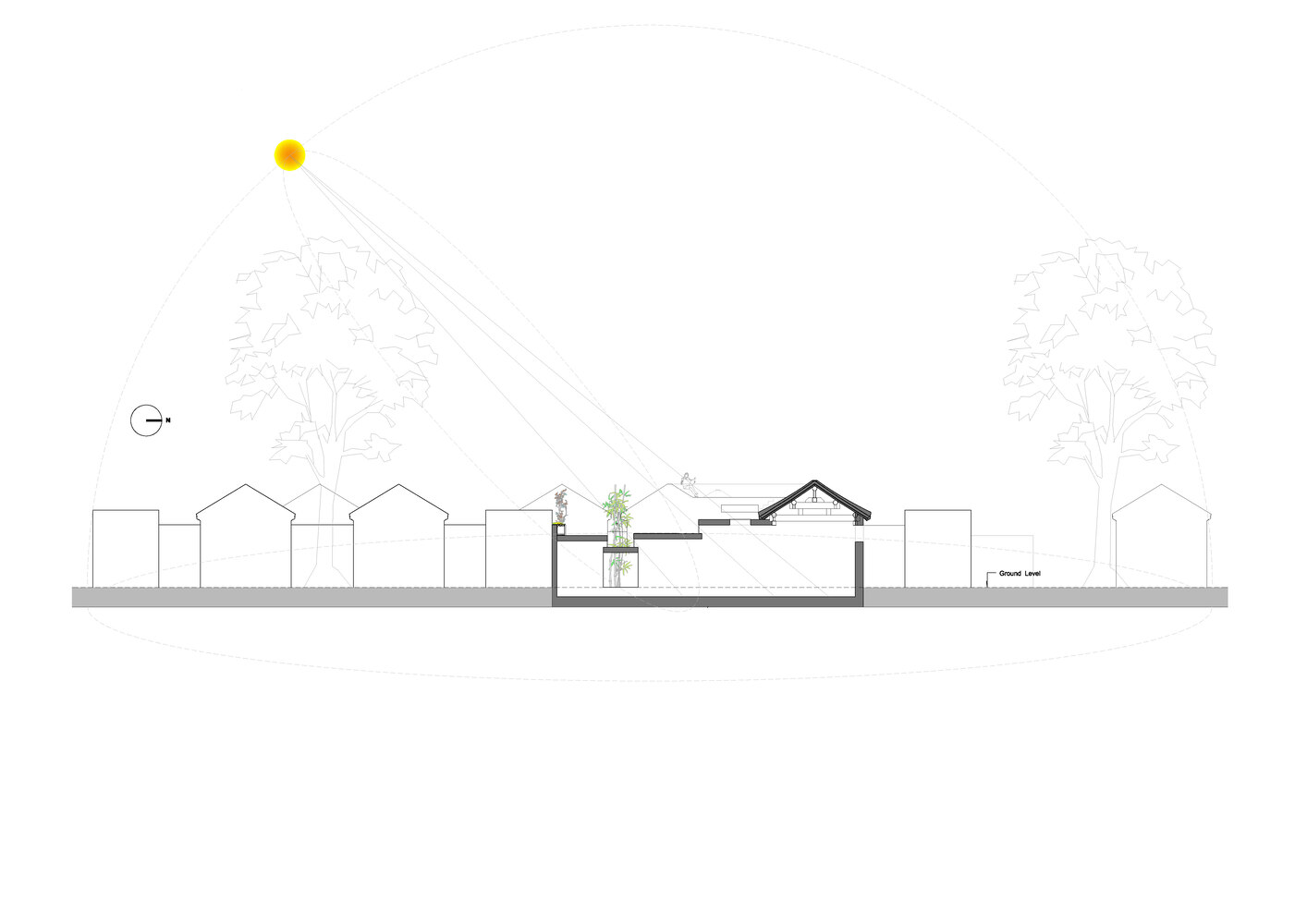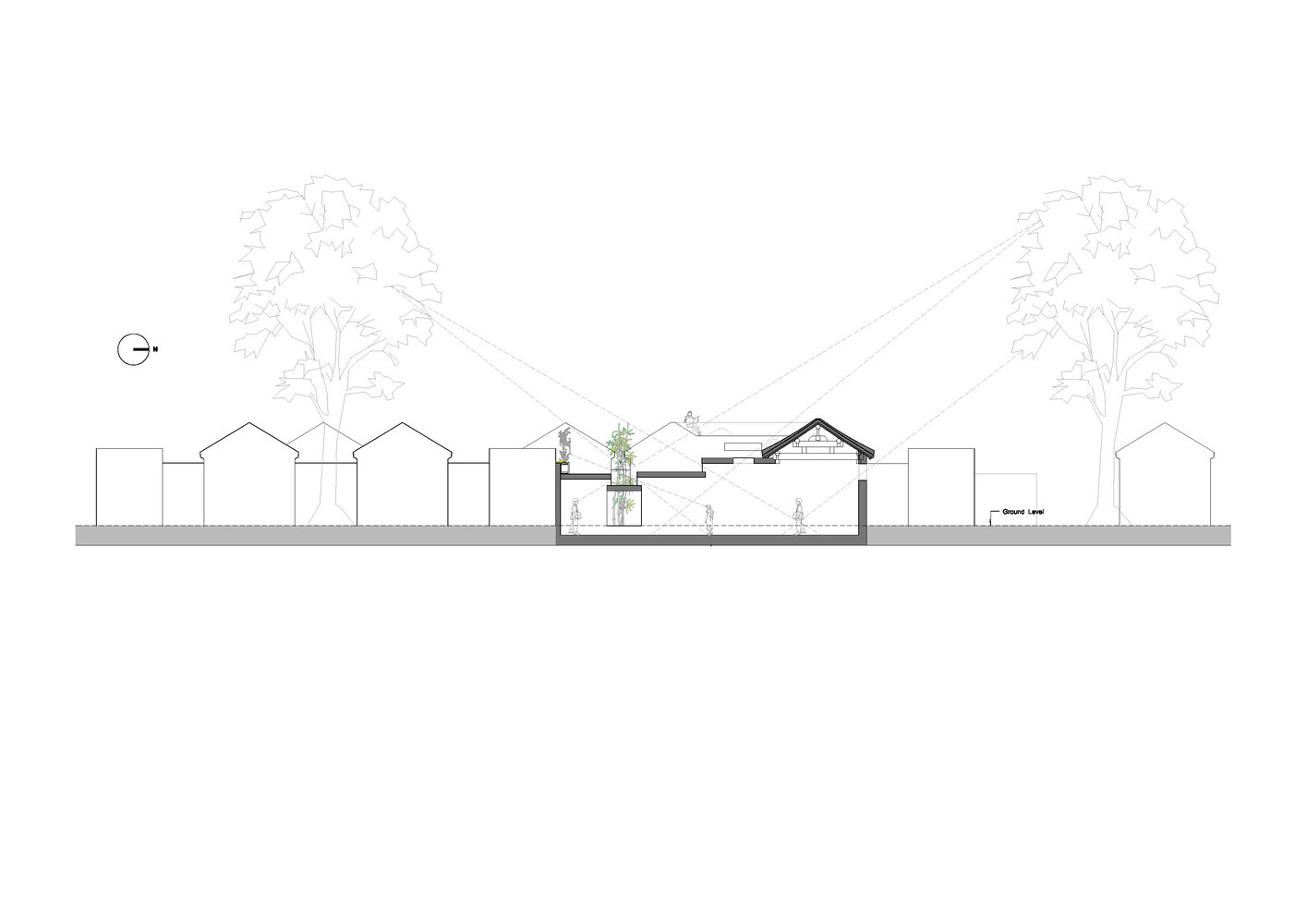 During the site survey, a protected ancient tree, approximately 21 meters tall, was discovered in a neighboring courtyard 32 meters to the south. This tree became a focal highlight of the design.