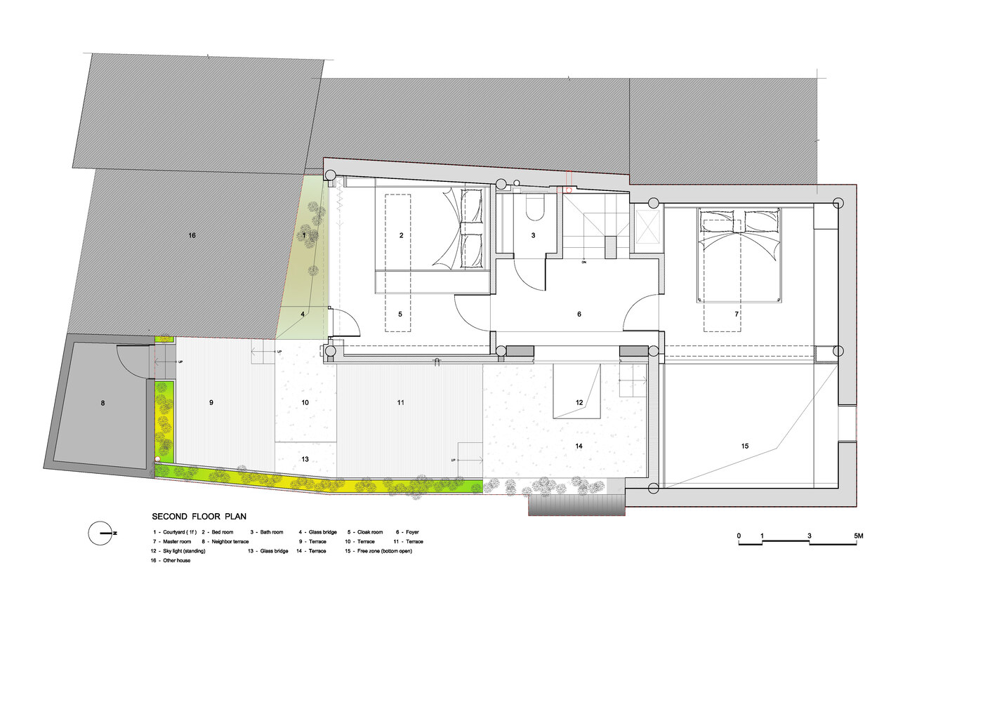 To improve these issues: -The northwest courtyard was slightly expanded, the ladder removed, and it was converted into a landscaped garden, enhancing natural lighting and visual continuity.