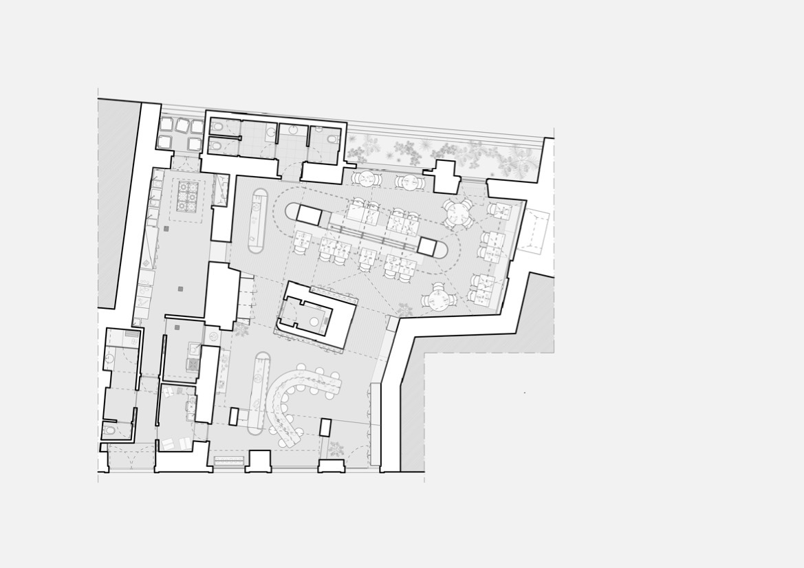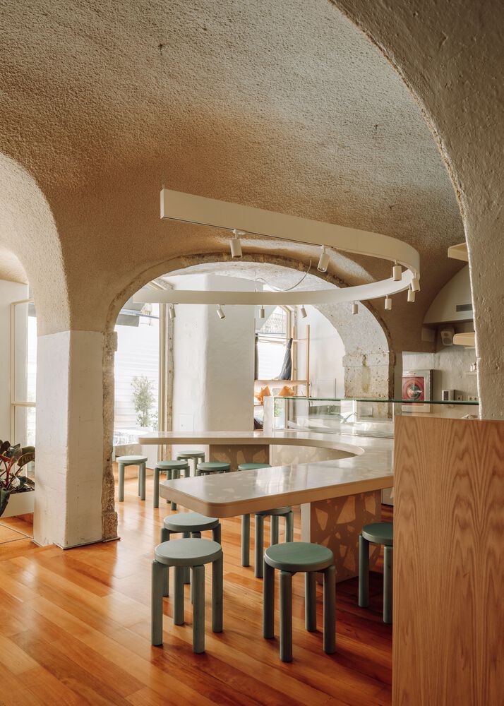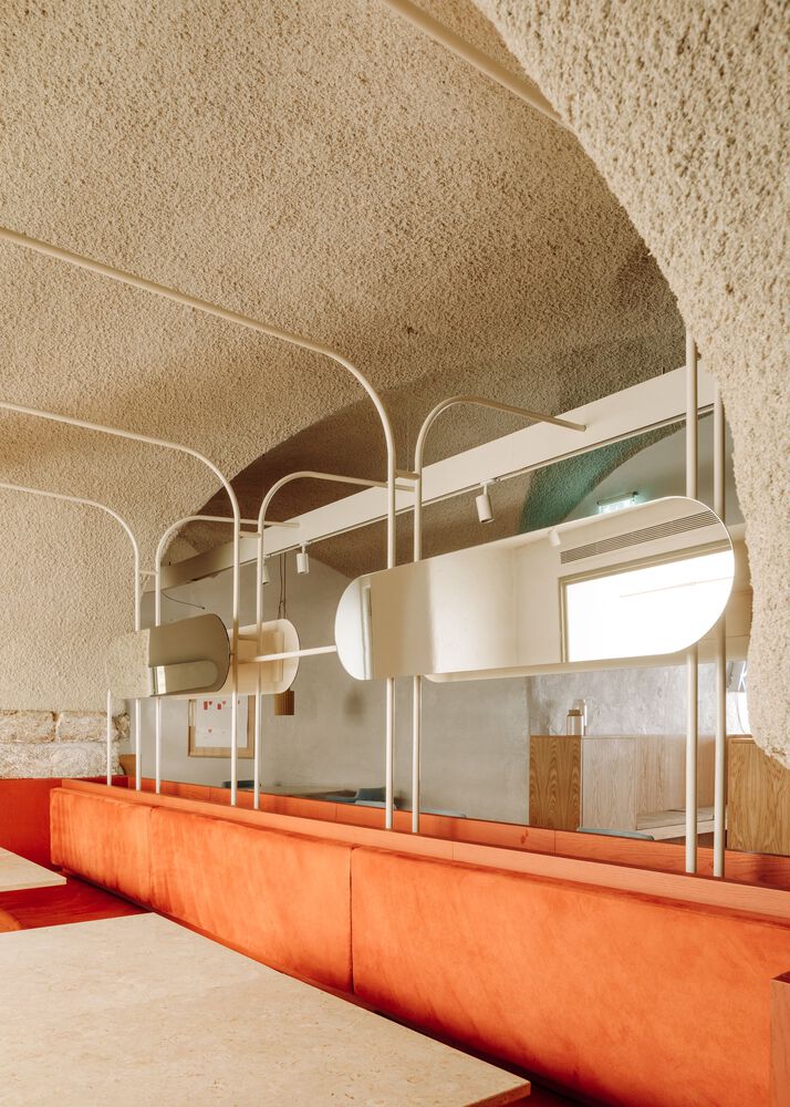 The back room was designed as a dinning area with separate tables gathering around a central terracotta colour bench that connects the two columns.